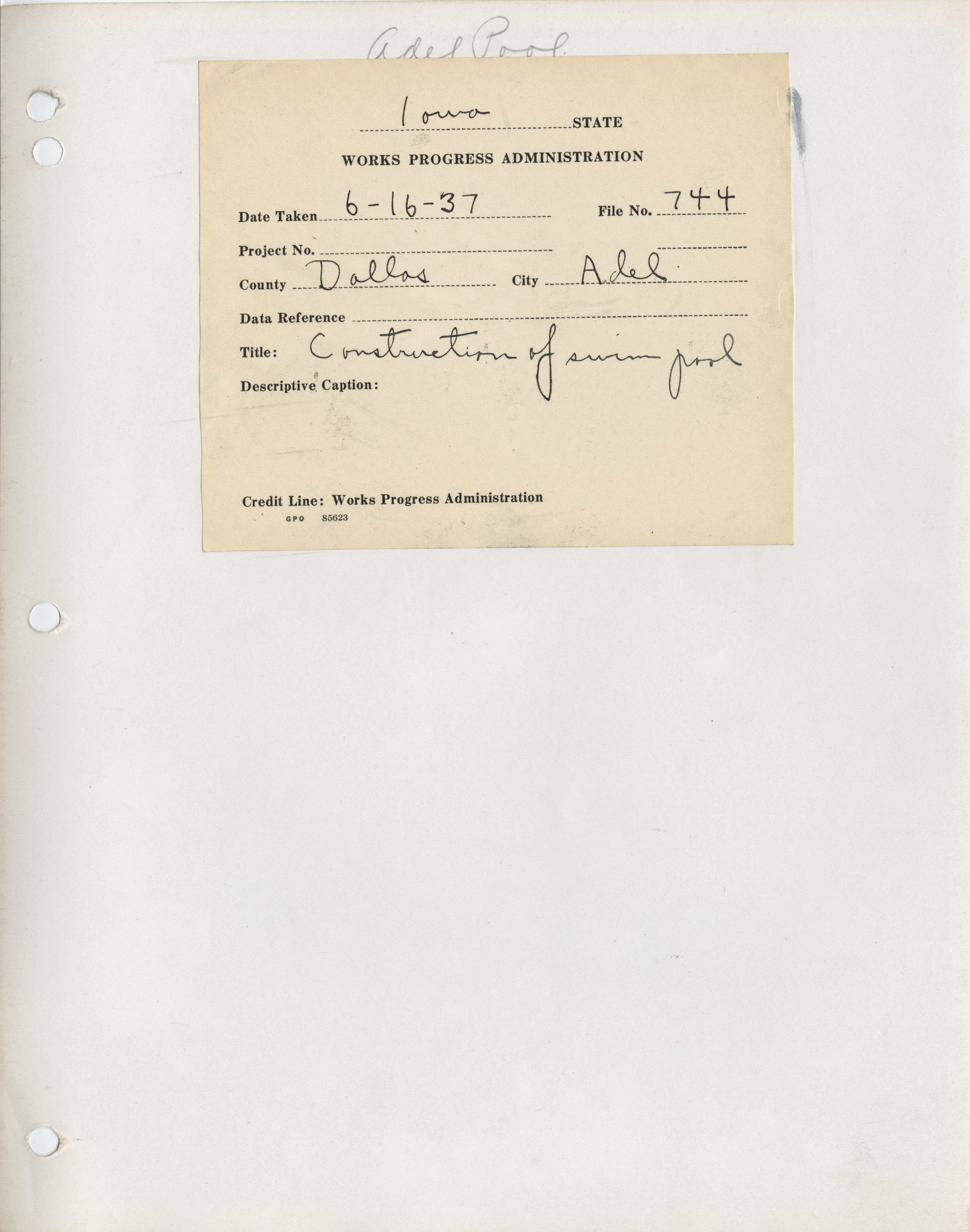 - "Photograph of people working on a swimming pool in Adel", Work Projects Administration (Iowa) Photographs, Iowa State University Library Digital Collections