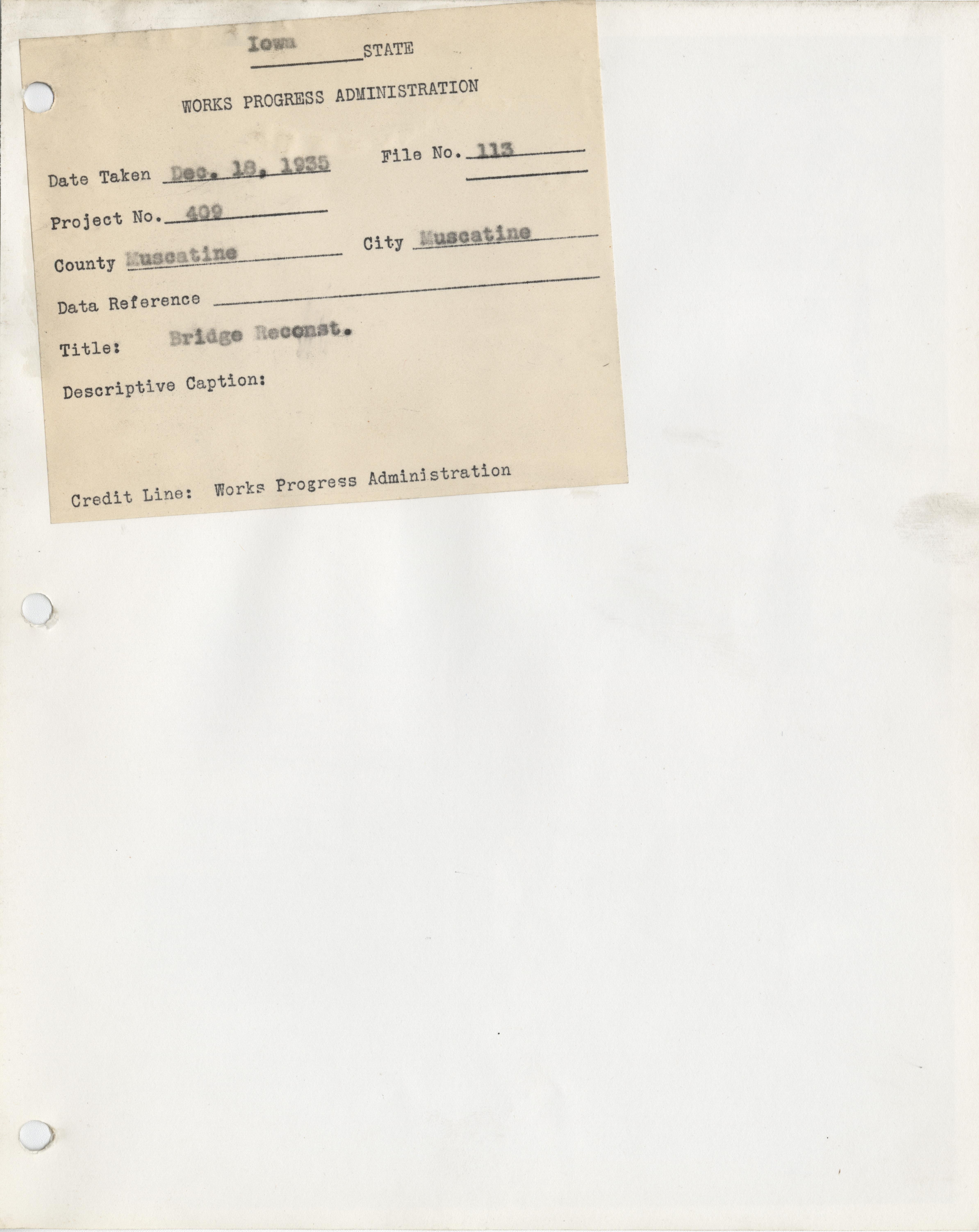 - District 2. Muscatine County. Muscatine. Bridge Reconstruction. Project 409. (1 b/w photograph), 1935
