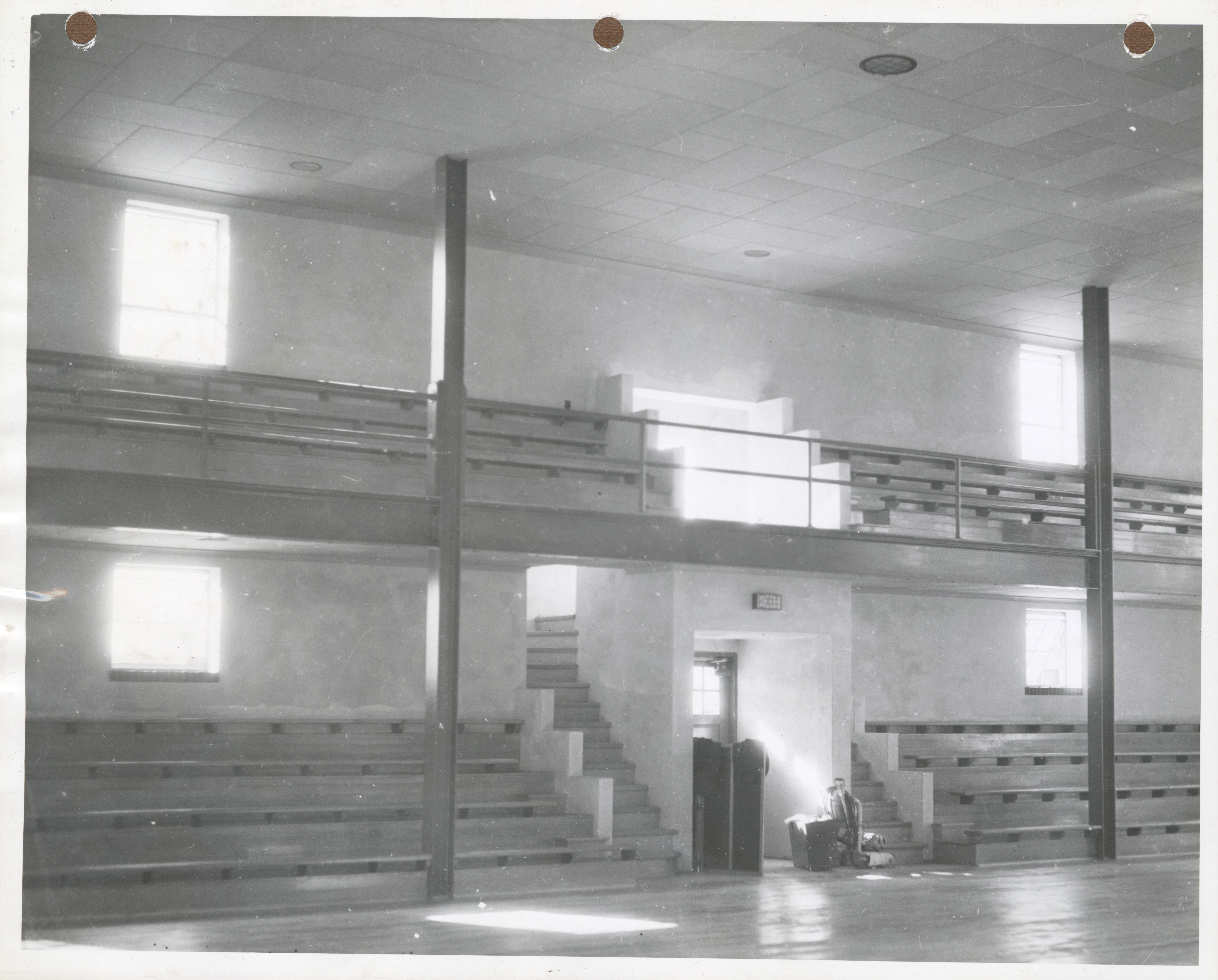 - Photograph of the bleachers surrounding the entrance to the high school gym in Panora