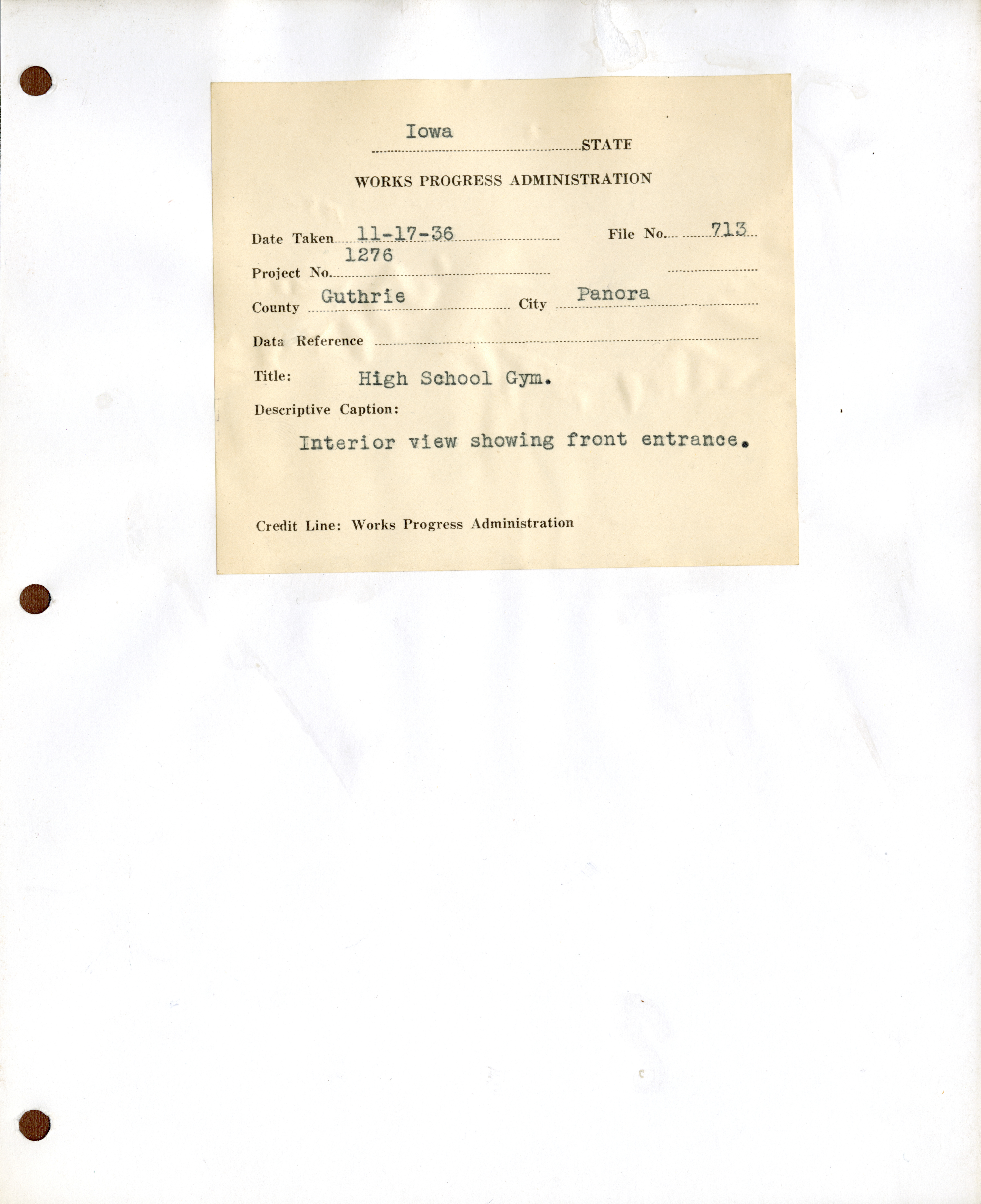 - District 4. Guthrie County. Panora. High School Gymnasium, Includes Shot of Basketball Game on 2/15/38. Project 1276. (7 b/w photographs), 1936-1938