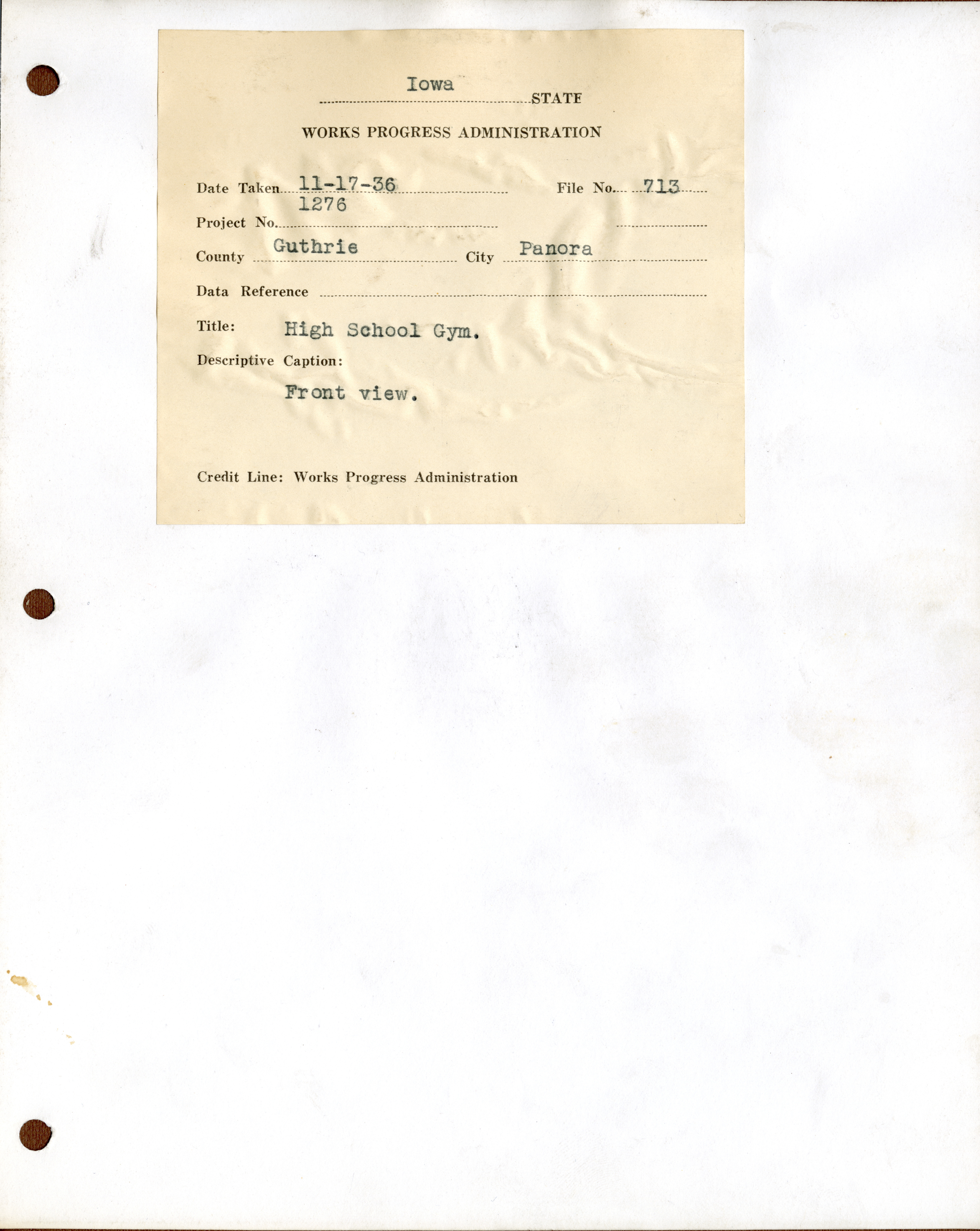 - "Photograph of the front view of the high school gym in Panora", Work Projects Administration (Iowa) Photographs, Iowa State University Library Digital Collections