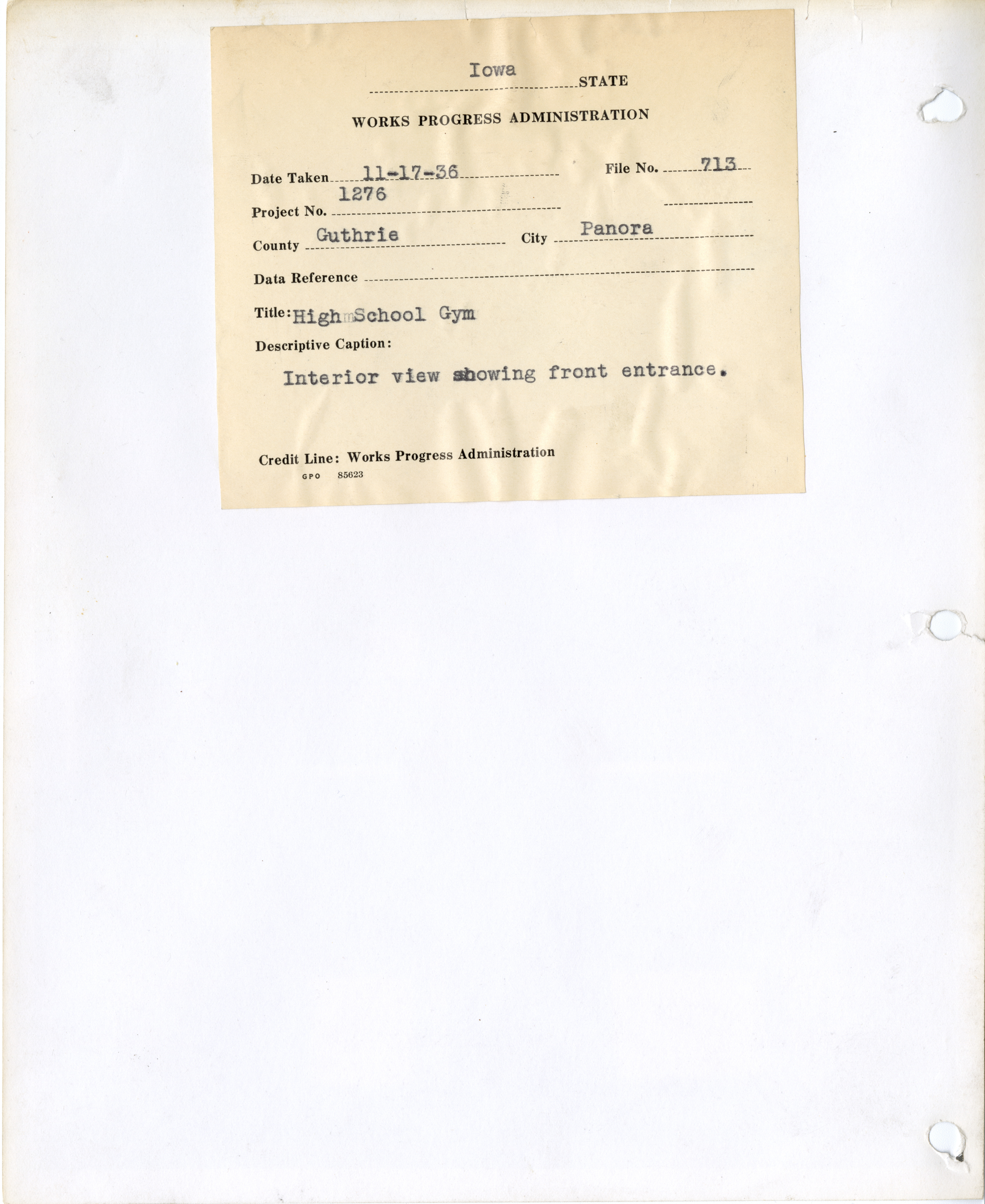 - "Photograph of the interior view of the entrance to the high school gym in Panora", Work Projects Administration (Iowa) Photographs, Iowa State University Library Digital Collections