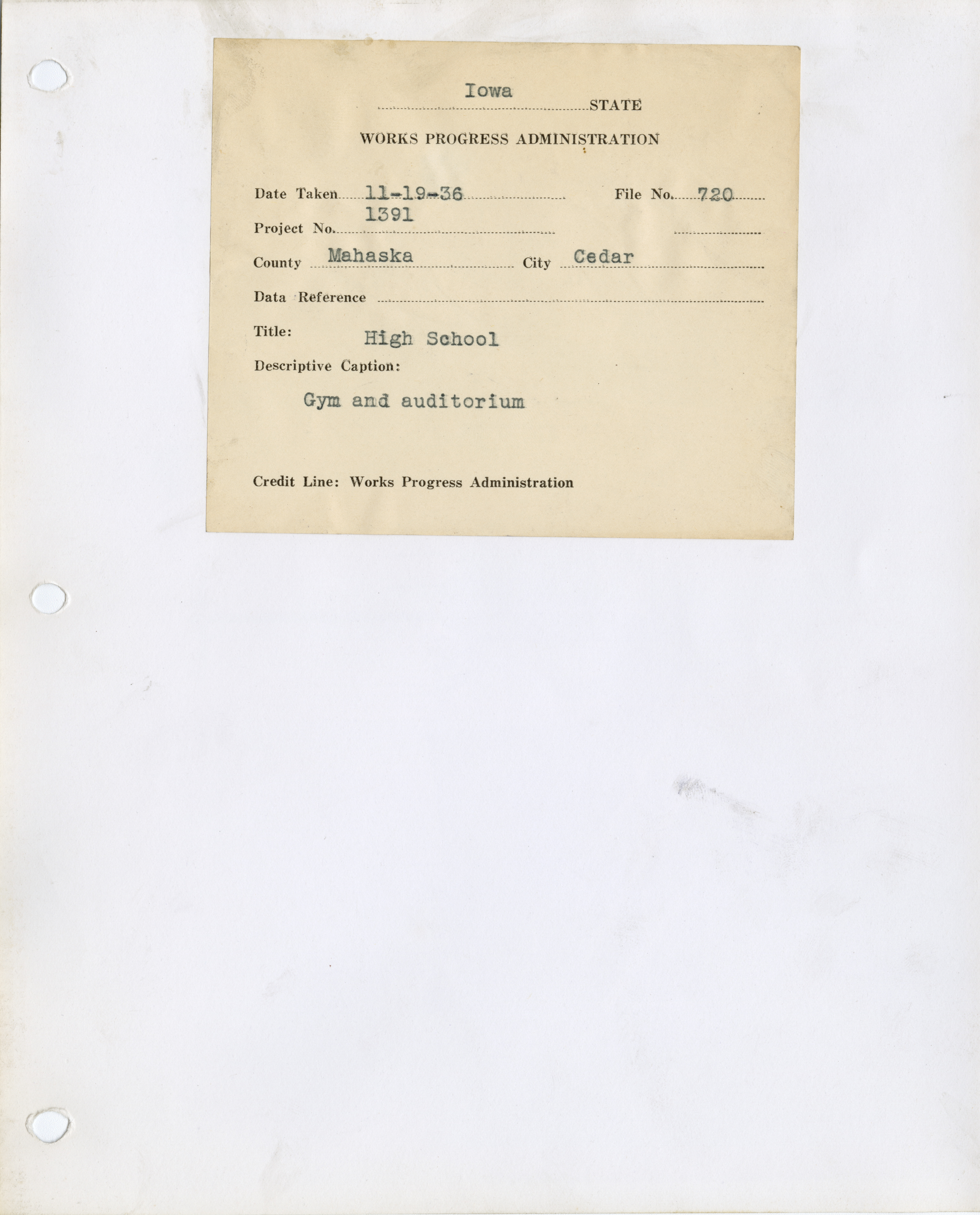 - District 4. Mahaska County. Cedar. High School Gym and Auditorium. Project 1391. (4 b/w photographs), 1936-1937