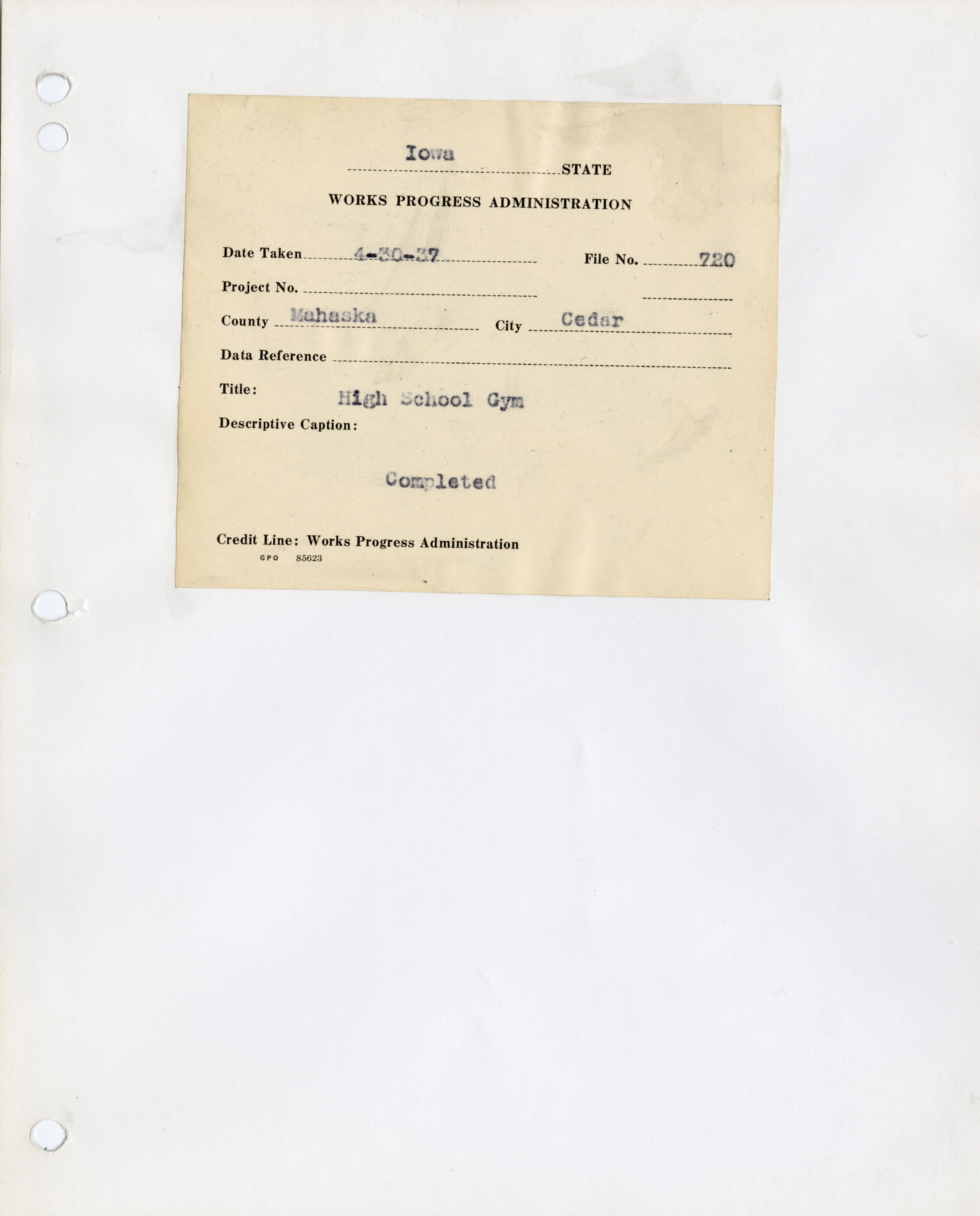 - District 4. Mahaska County. Cedar. High School Gym and Auditorium. Project 1391. (4 b/w photographs), 1936-1937
