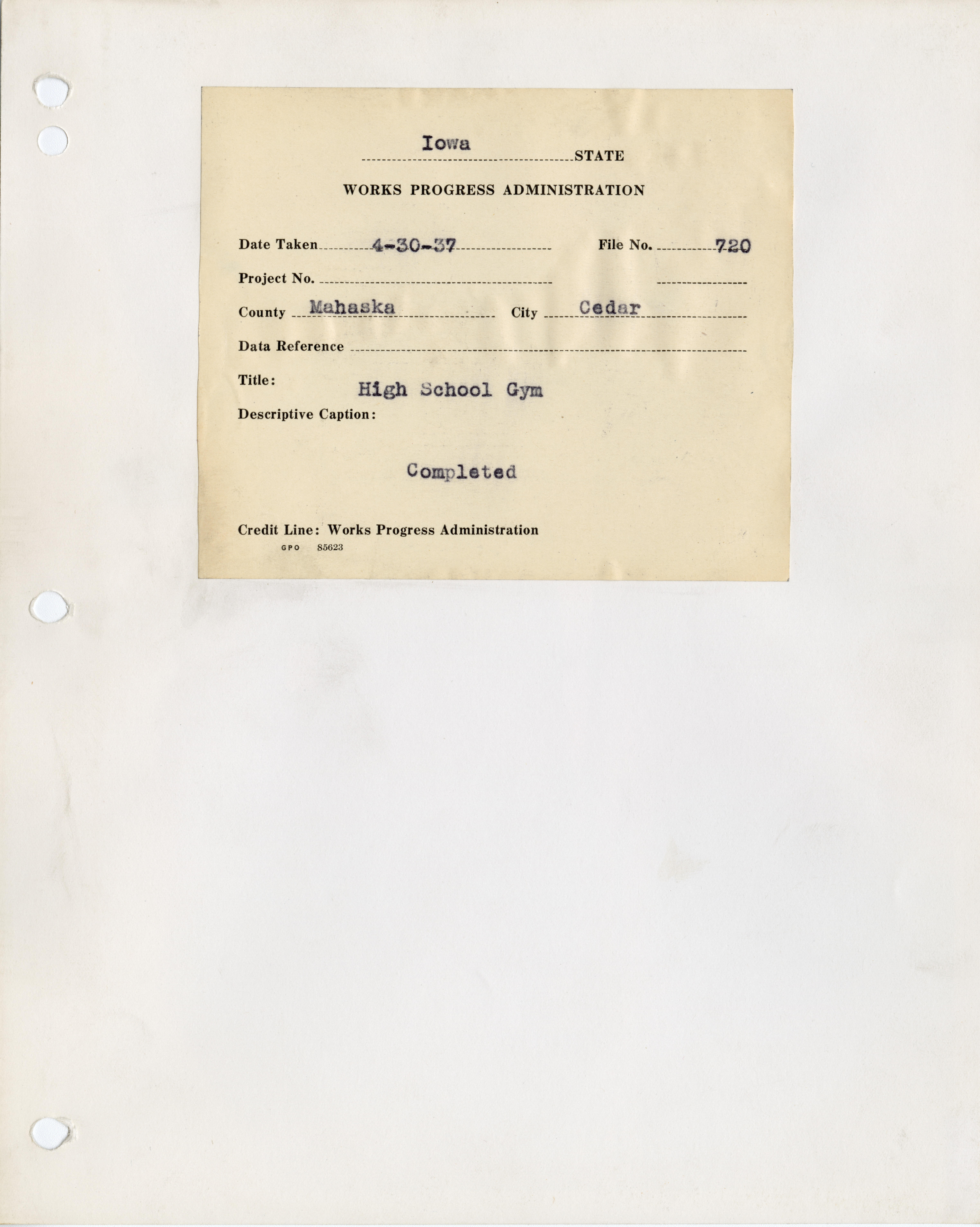 - "Photograph of the high school gym in Cedar", Work Projects Administration (Iowa) Photographs, Iowa State University Library Digital Collections
