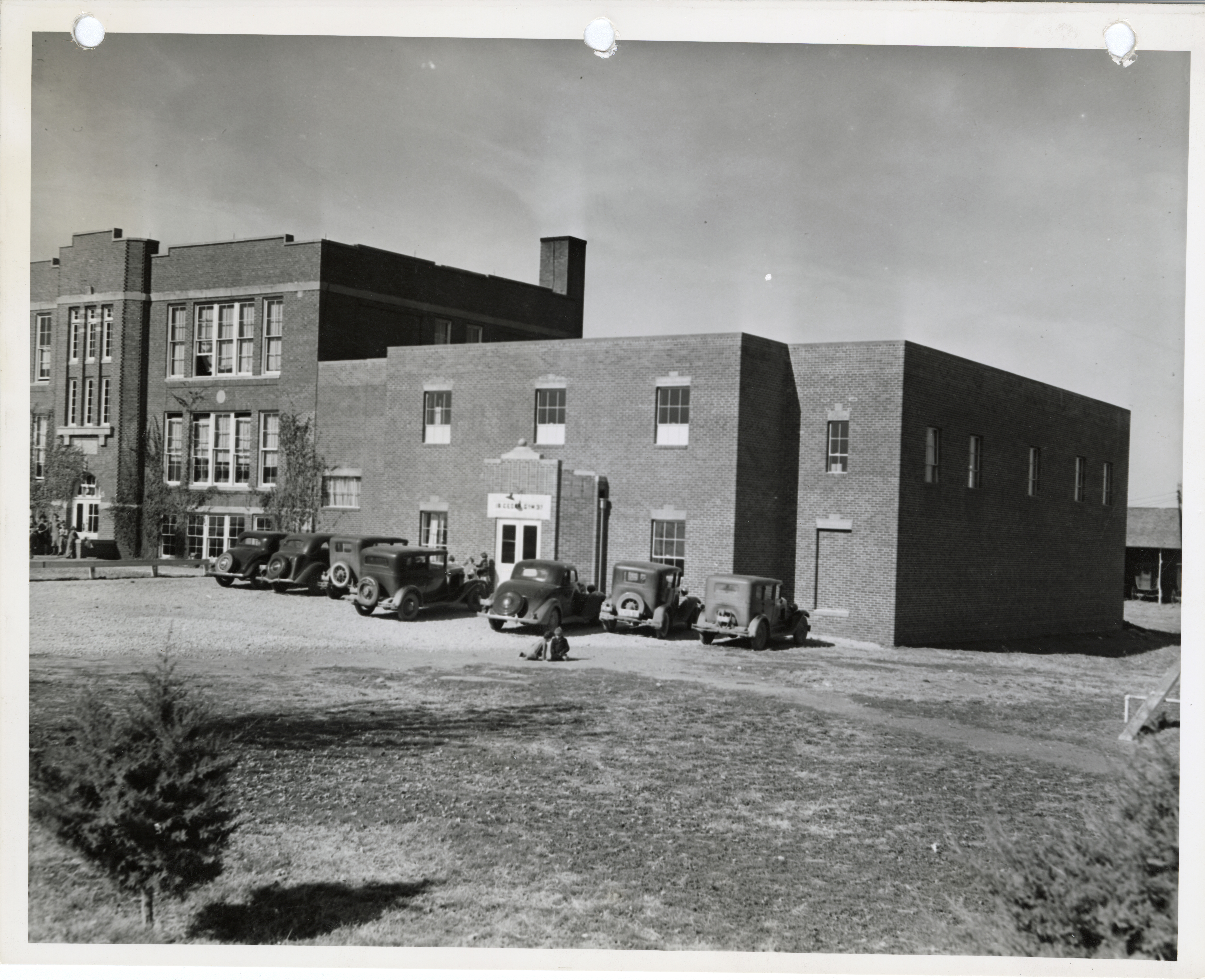 - Photograph of cars parked outside the high school gym in Cedar