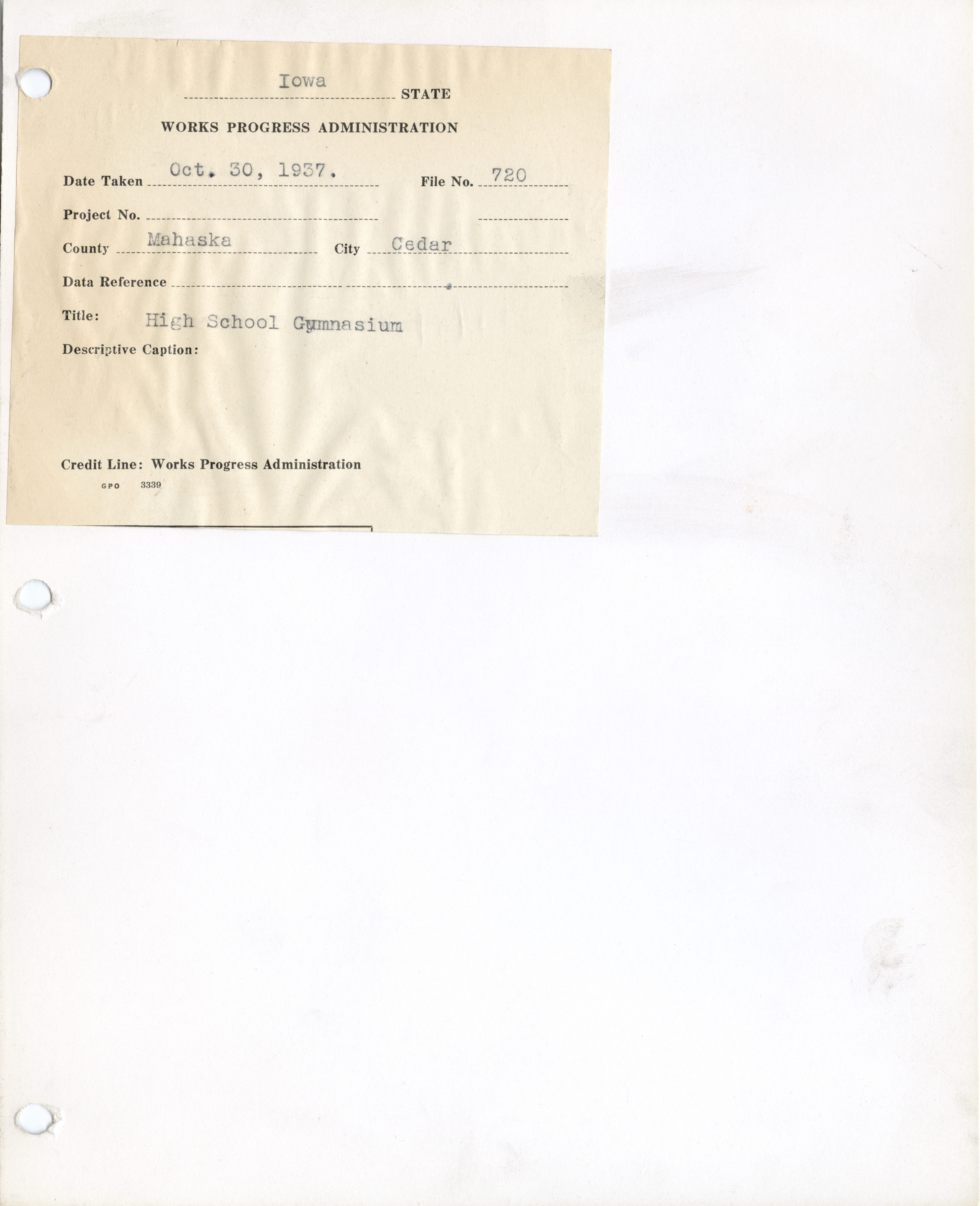 - District 4. Mahaska County. Cedar. High School Gym and Auditorium. Project 1391. (4 b/w photographs), 1936-1937