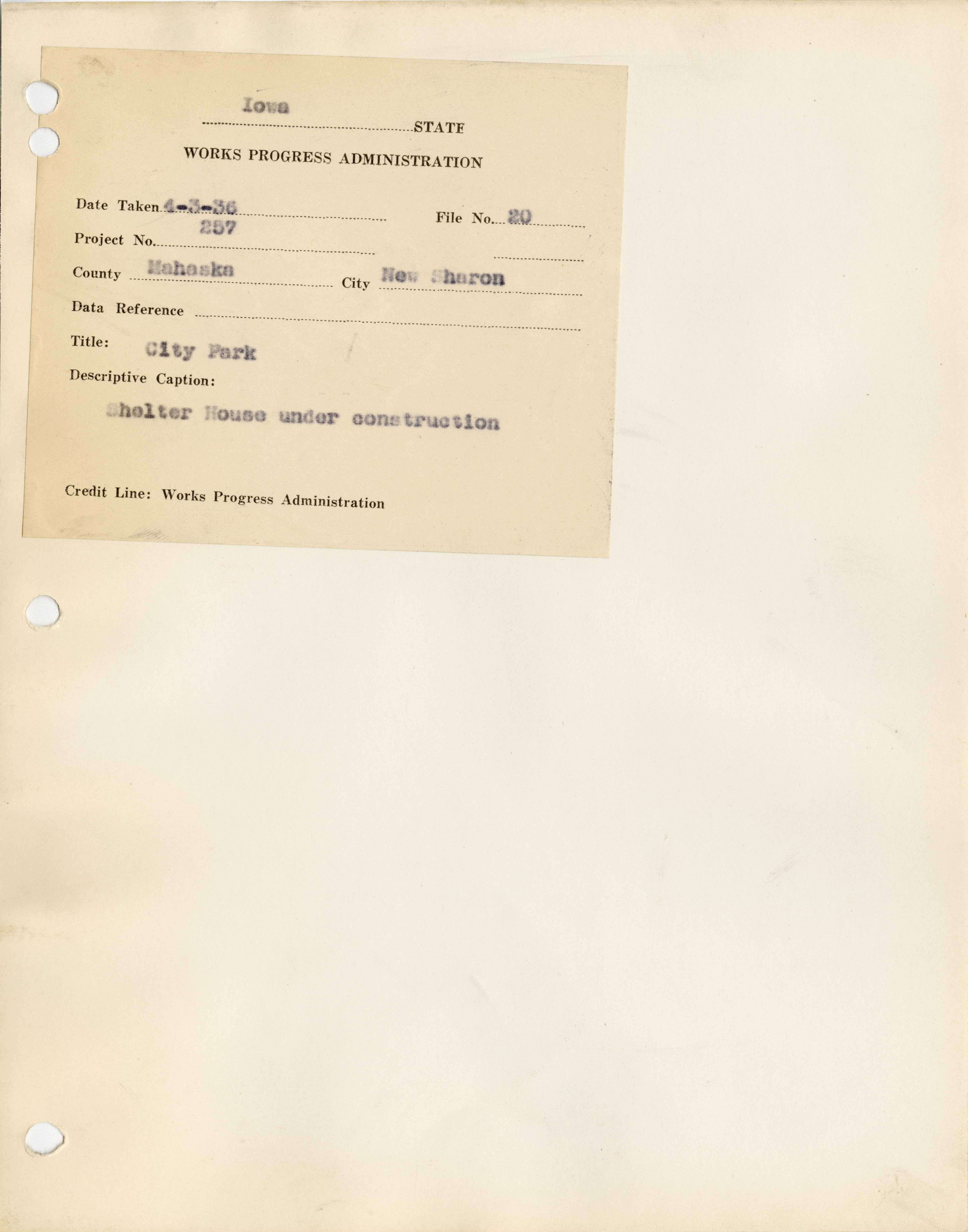 - "Photograph of people constructing a shelter house in New Sharon", Work Projects Administration (Iowa) Photographs, Iowa State University Library Digital Collections