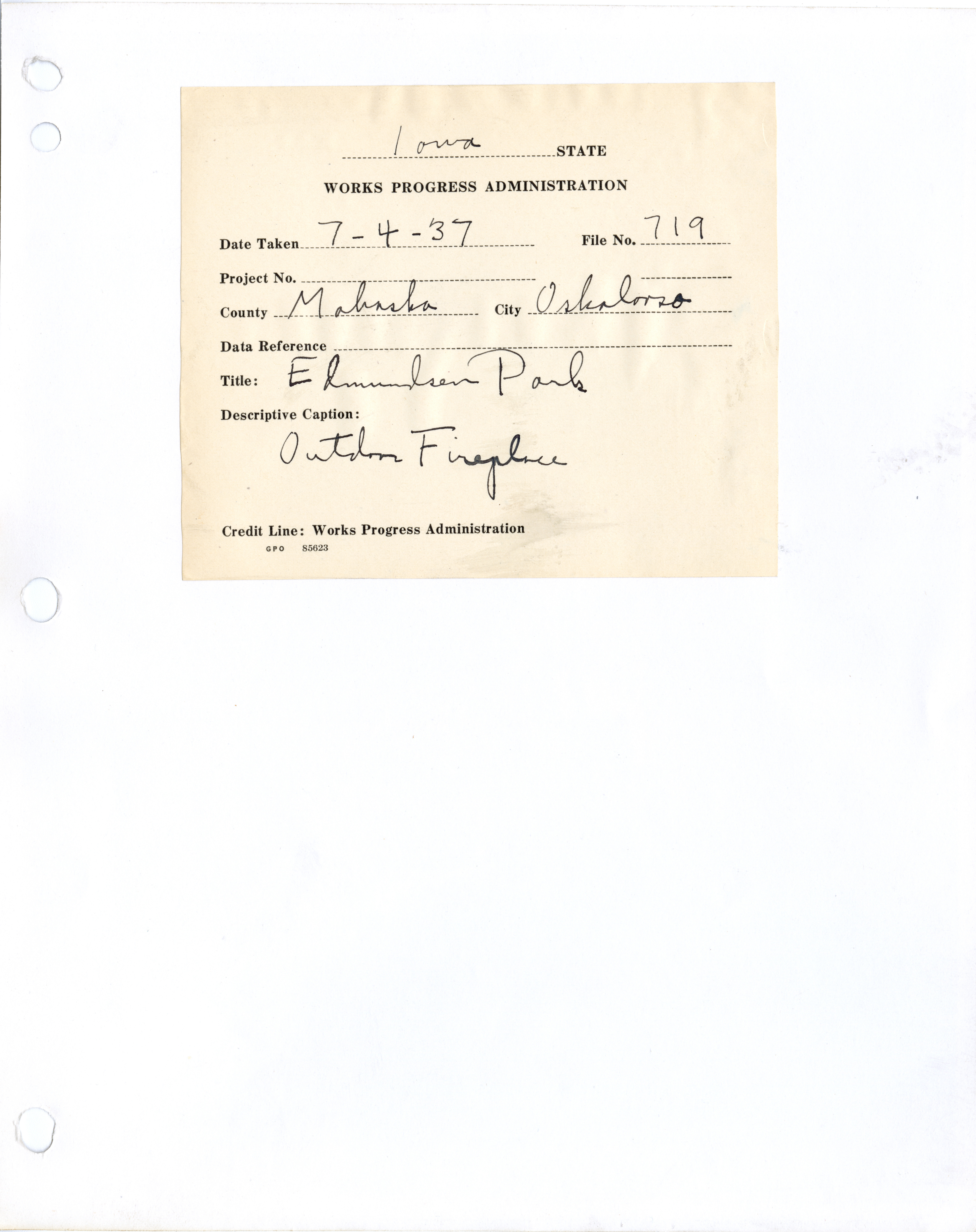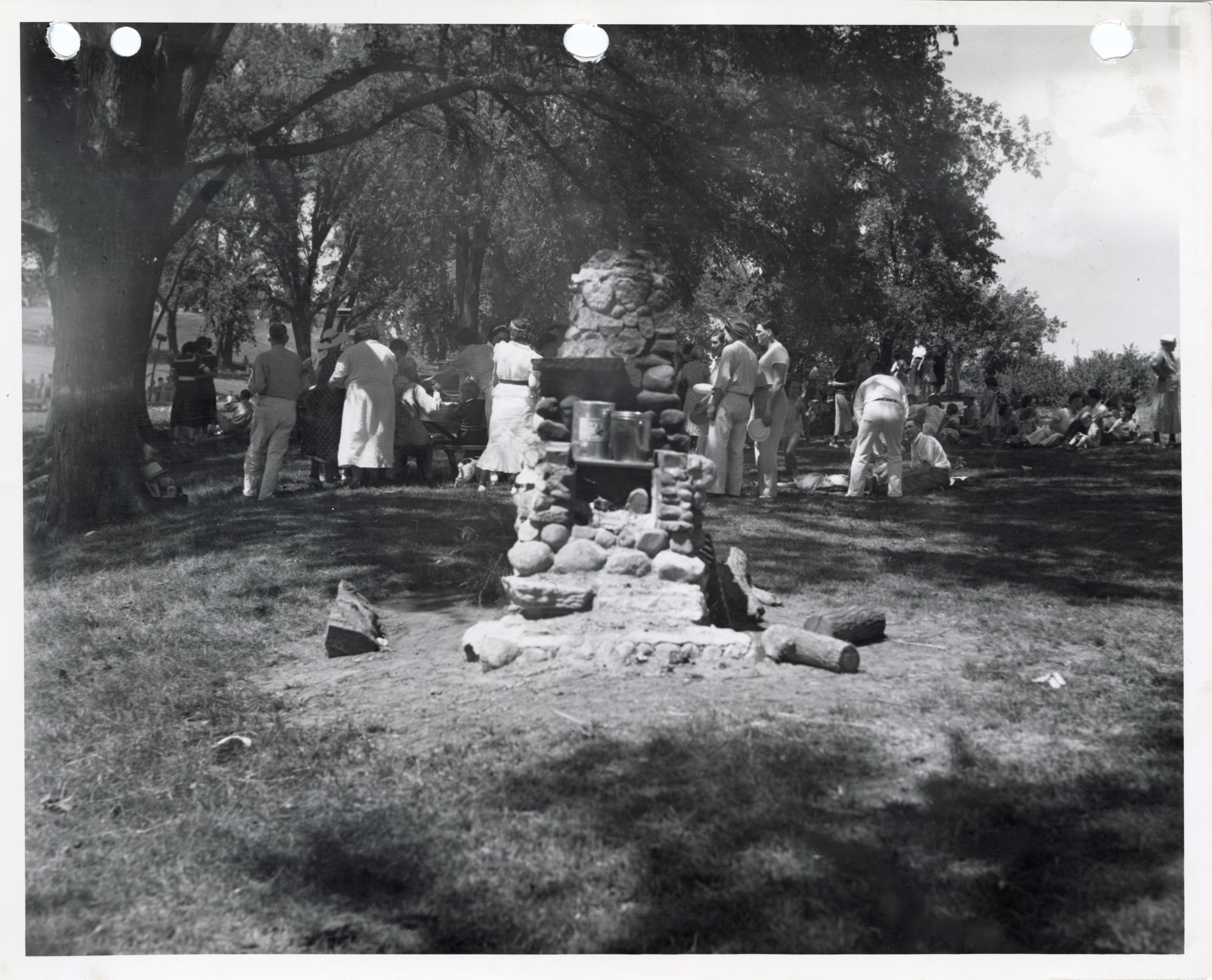 - "Photograph of people standing around an outdoor fireplace at Edmundson Park in Oskaloosa", Work Projects Administration (Iowa) Photographs, Iowa State University Library Digital Collections
