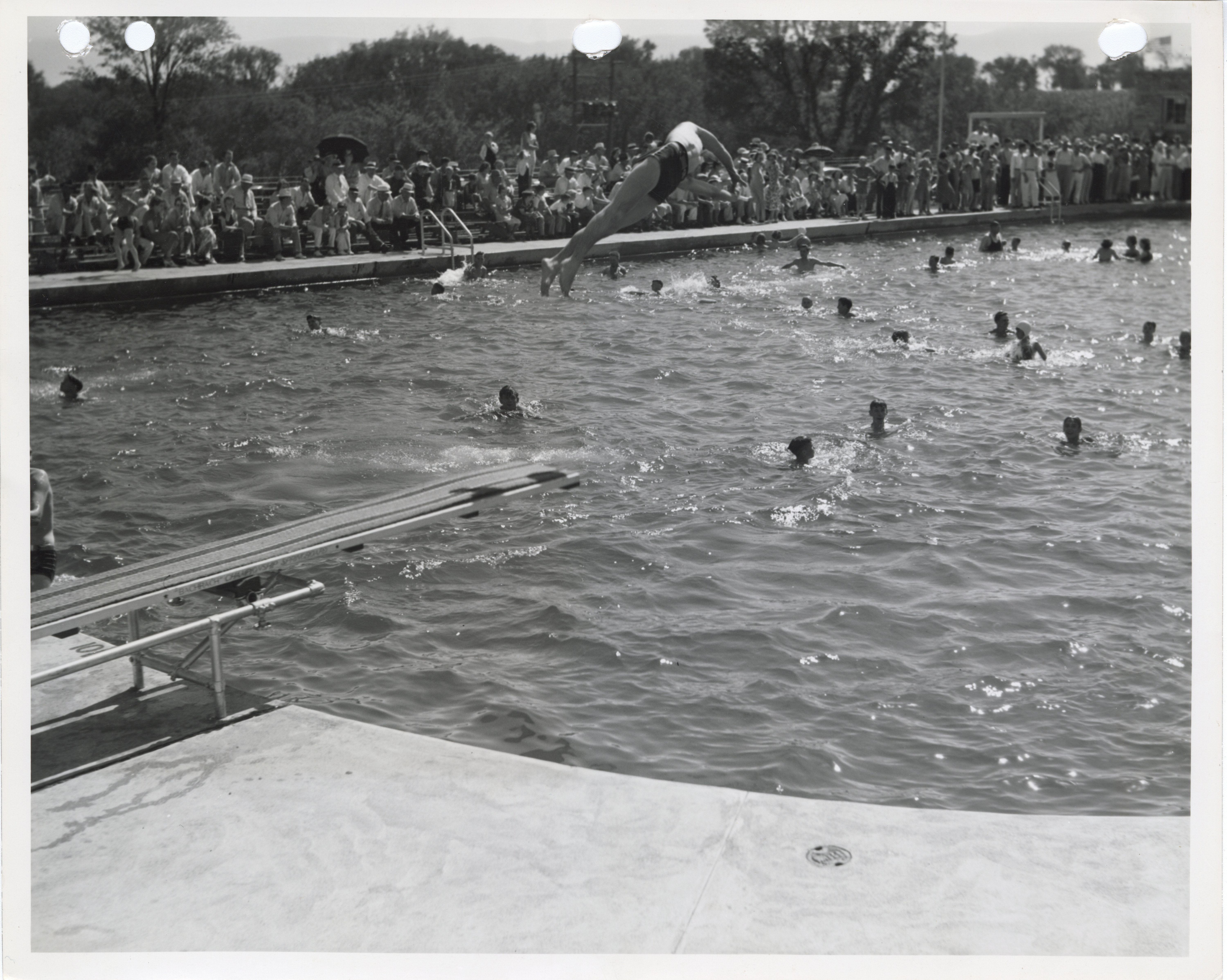 - "Photograph of people at the diving board and swimming pool at Edmundson Park in Oskaloosa", Work Projects Administration (Iowa) Photographs, Iowa State University Library Digital Collections