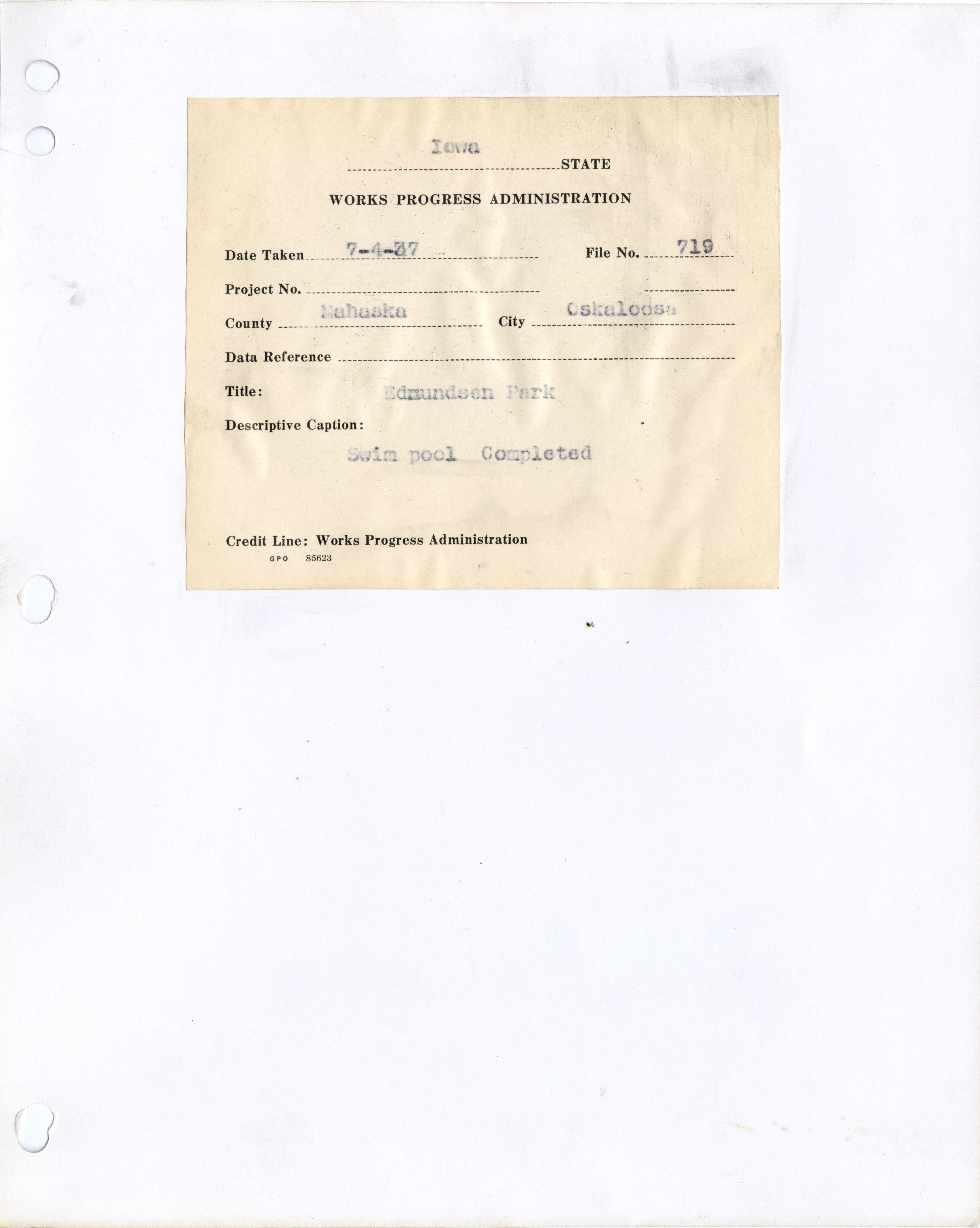 - District 4. Mahaska County. Oskaloosa. Edmondson Park Swimming Pool. Project 1929. (4 b/w photographs), 1936-1937