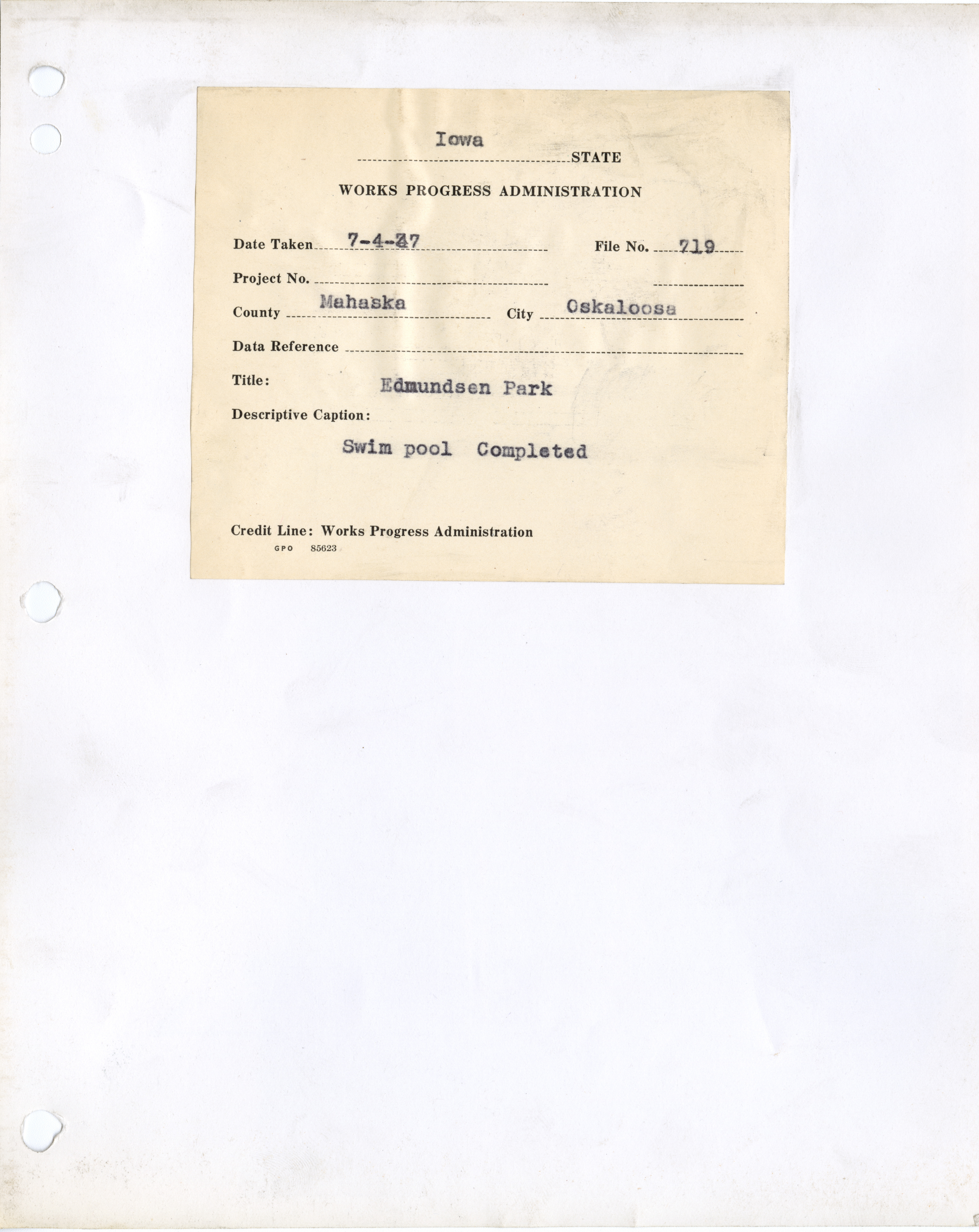 - District 4. Mahaska County. Oskaloosa. Edmondson Park Swimming Pool. Project 1929. (4 b/w photographs), 1936-1937