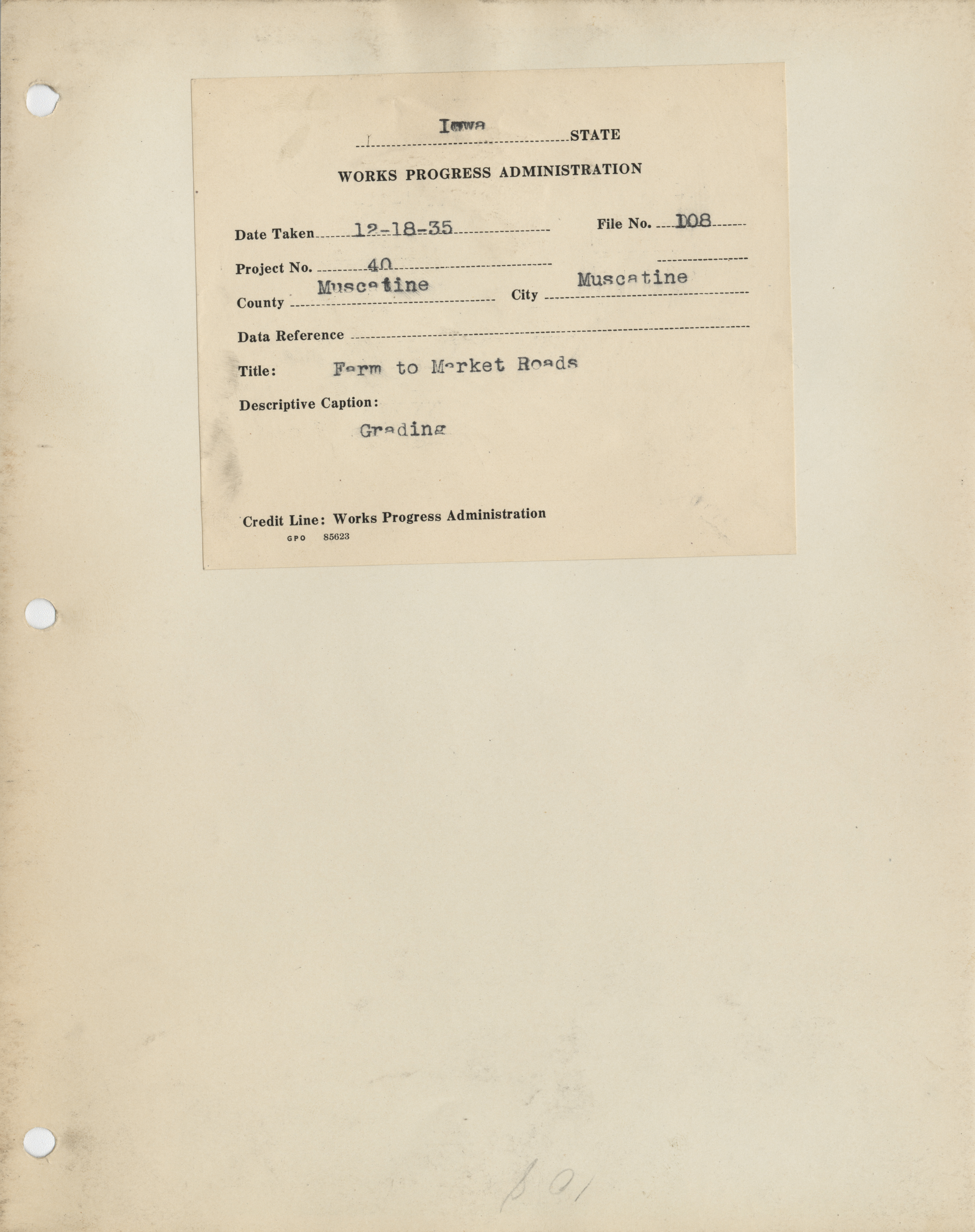 - "Photograph of a farm to market road where grading is being done in Muscatine County", Work Projects Administration (Iowa) Photographs, Iowa State University Library Digital Collections