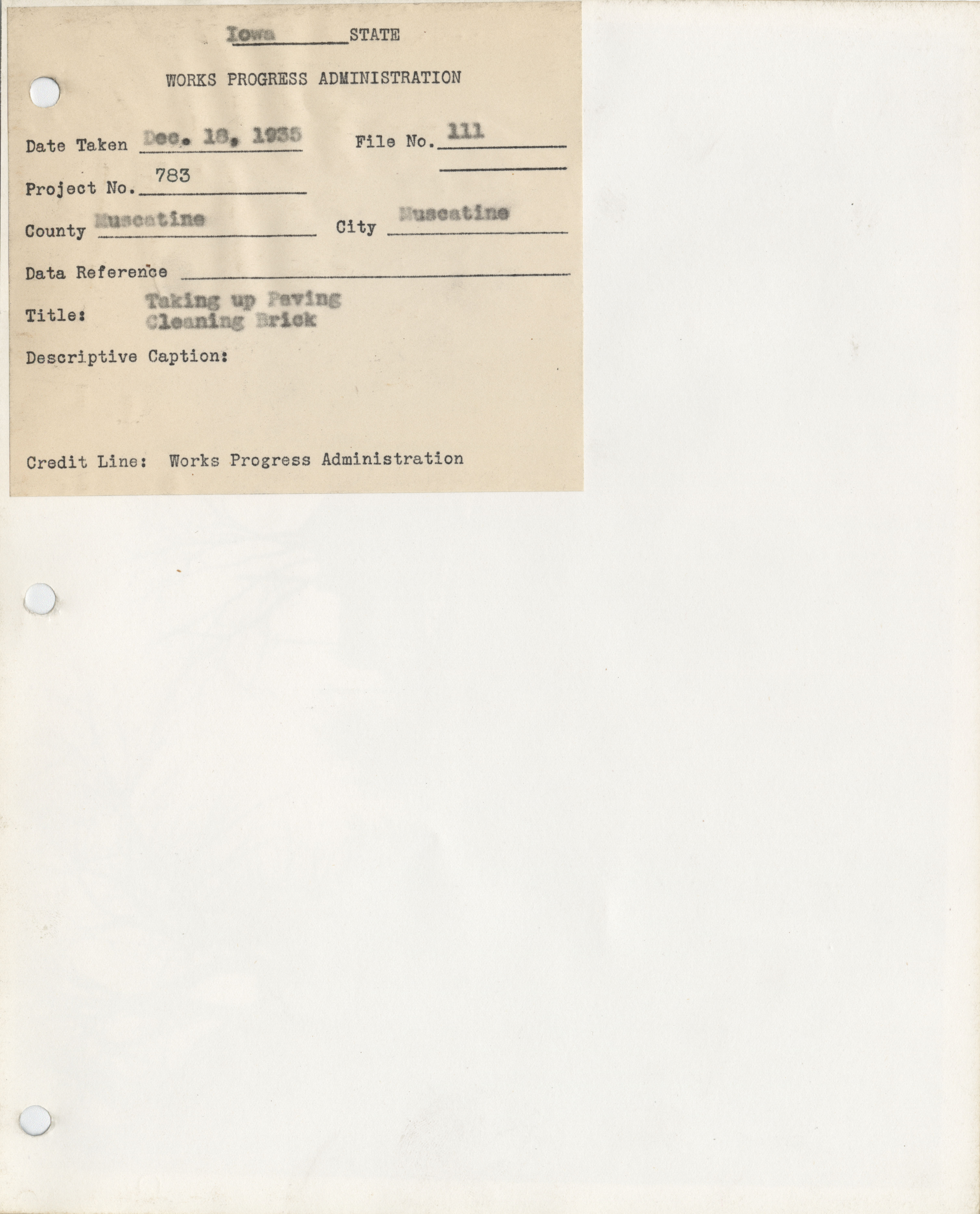 - "Photograph of people taking up paving and cleaning brick in Muscatine", Work Projects Administration (Iowa) Photographs, Iowa State University Library Digital Collections