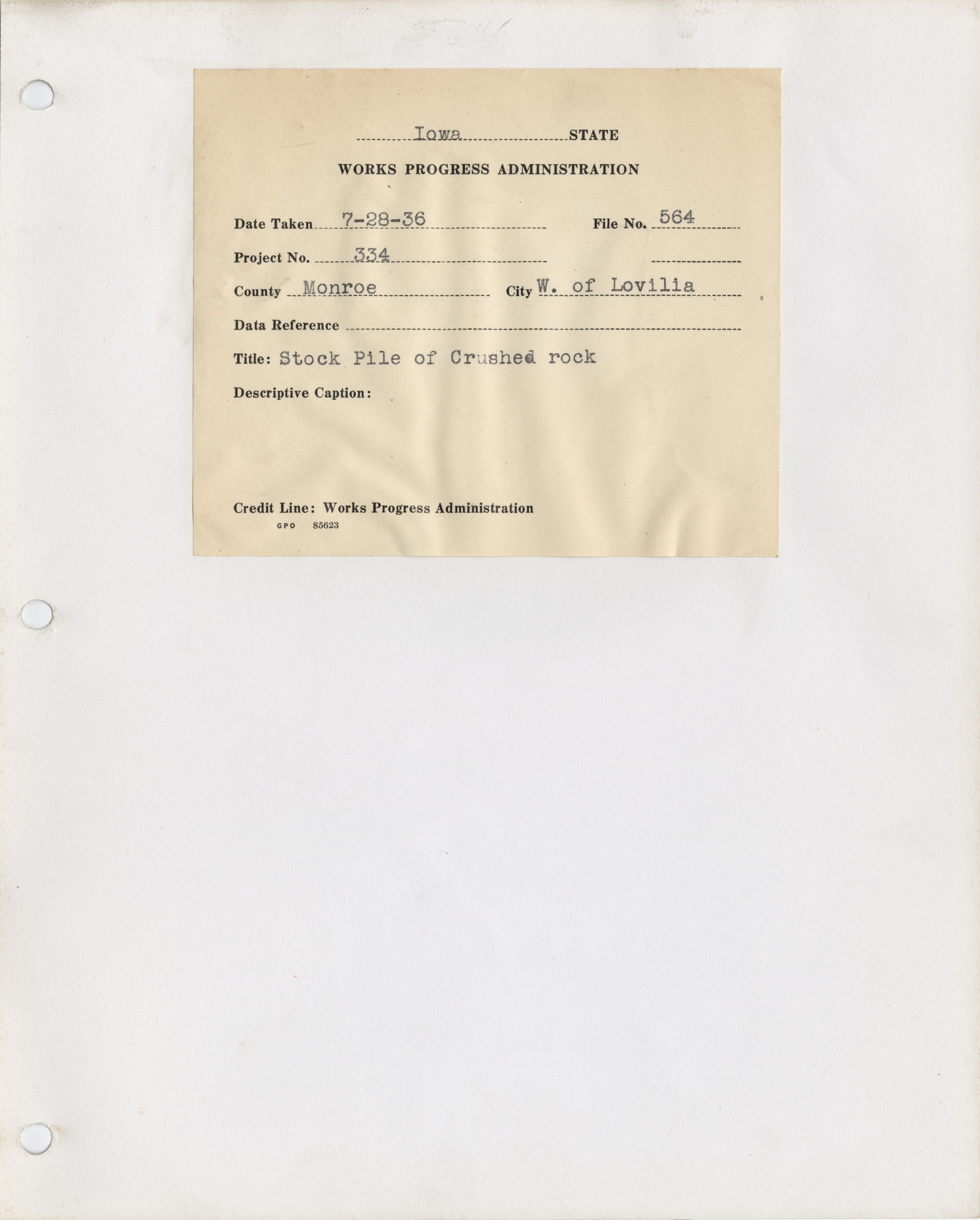 - "Photograph of a stockpile of crushed rock west of Lovilia", Work Projects Administration (Iowa) Photographs, Iowa State University Library Digital Collections