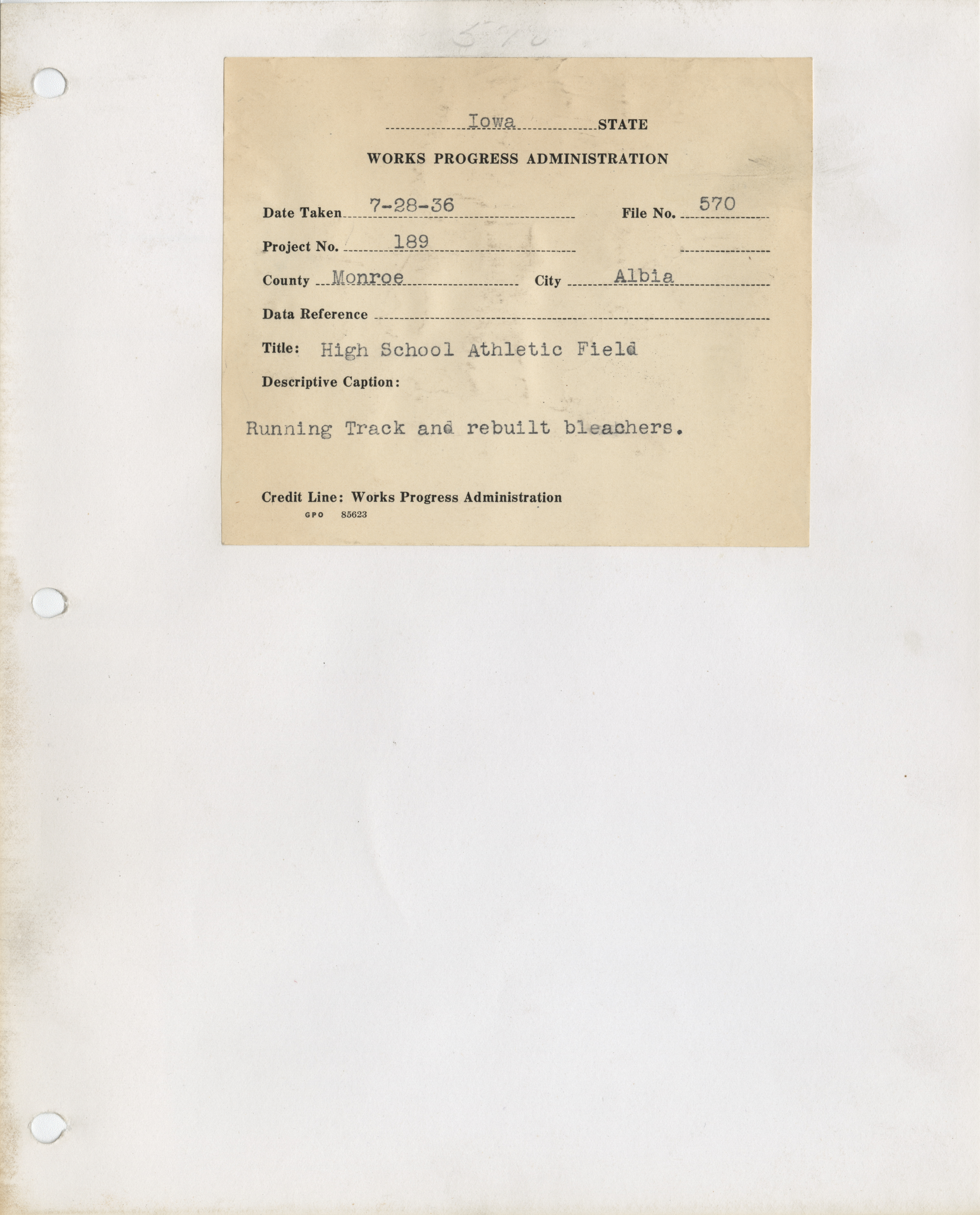 - District 4. Monroe County. Albia. High School Athletic Field. Project 189. (1 b/w photograph), 1936