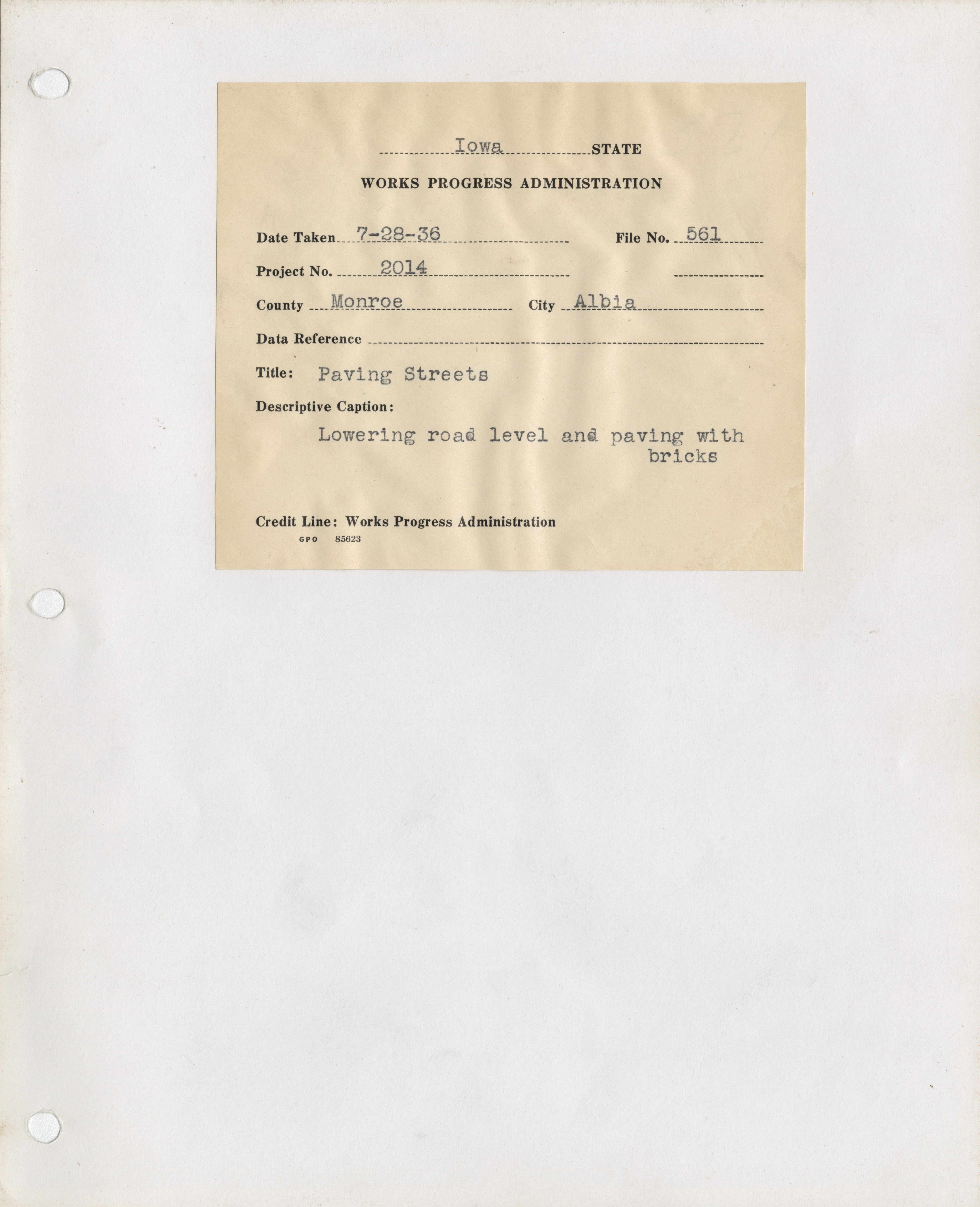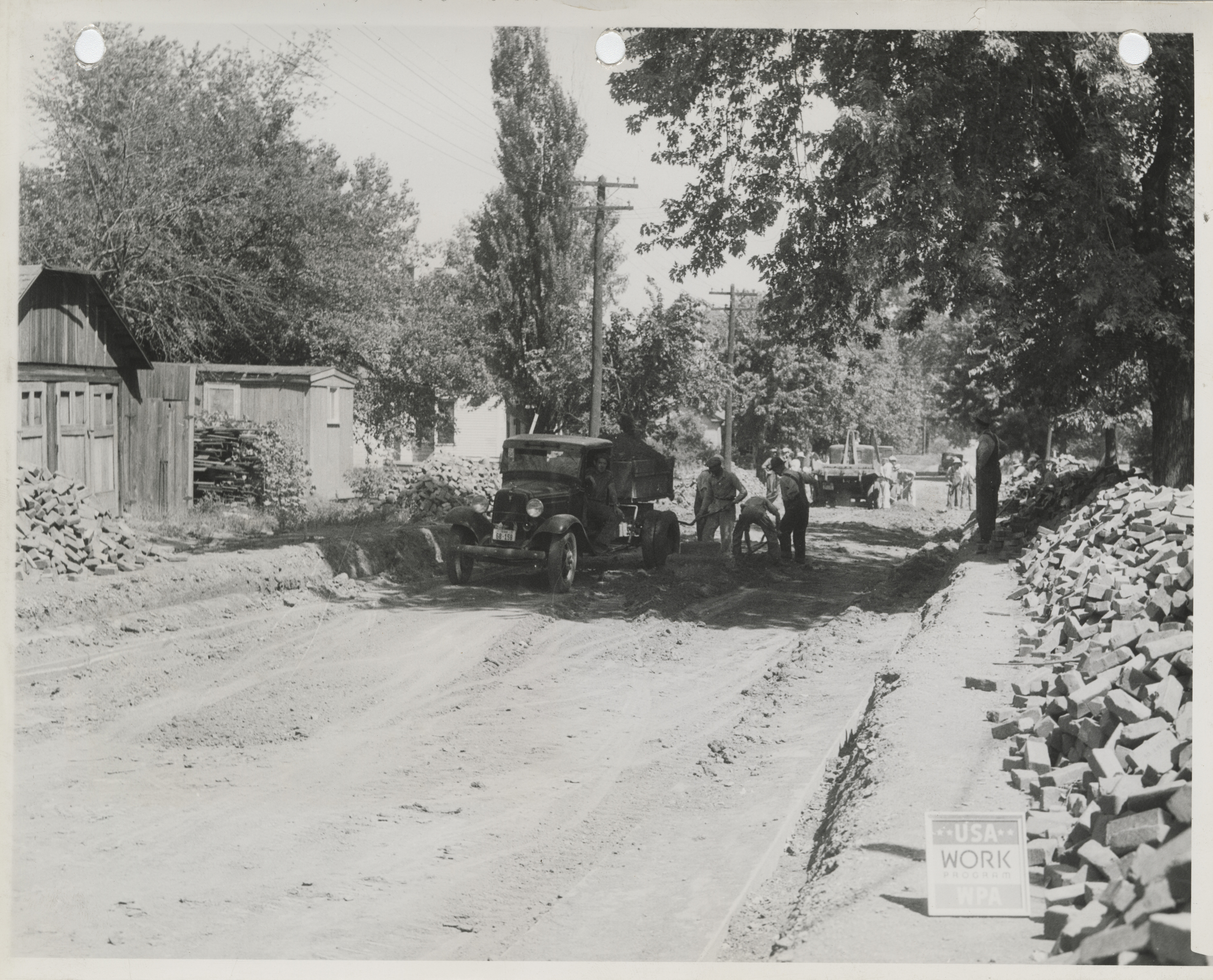- "Photograph of people lowering a street level and paving it with bricks in Albia", Work Projects Administration (Iowa) Photographs, Iowa State University Library Digital Collections
