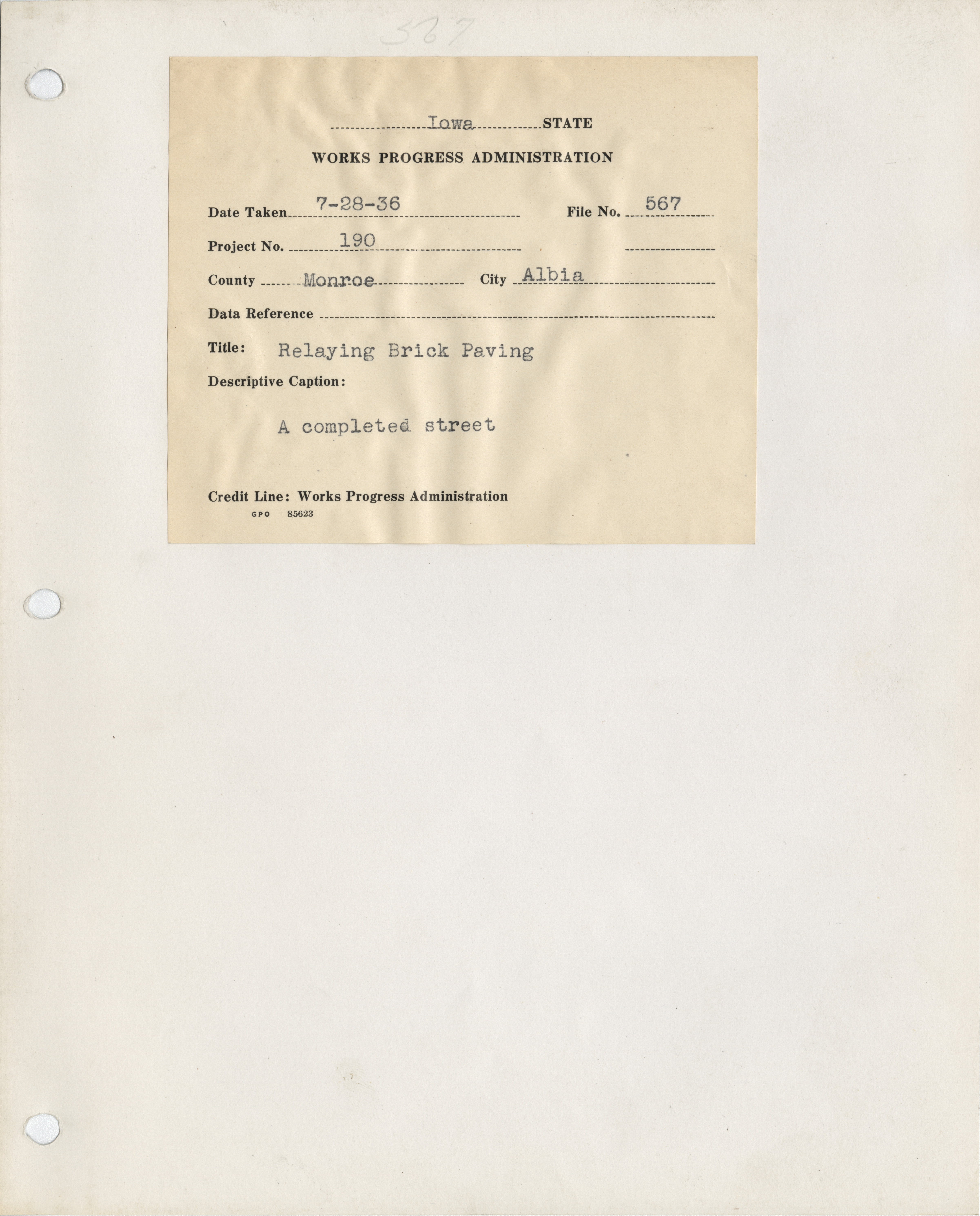 - "Photograph of a brick paved street in Albia", Work Projects Administration (Iowa) Photographs, Iowa State University Library Digital Collections