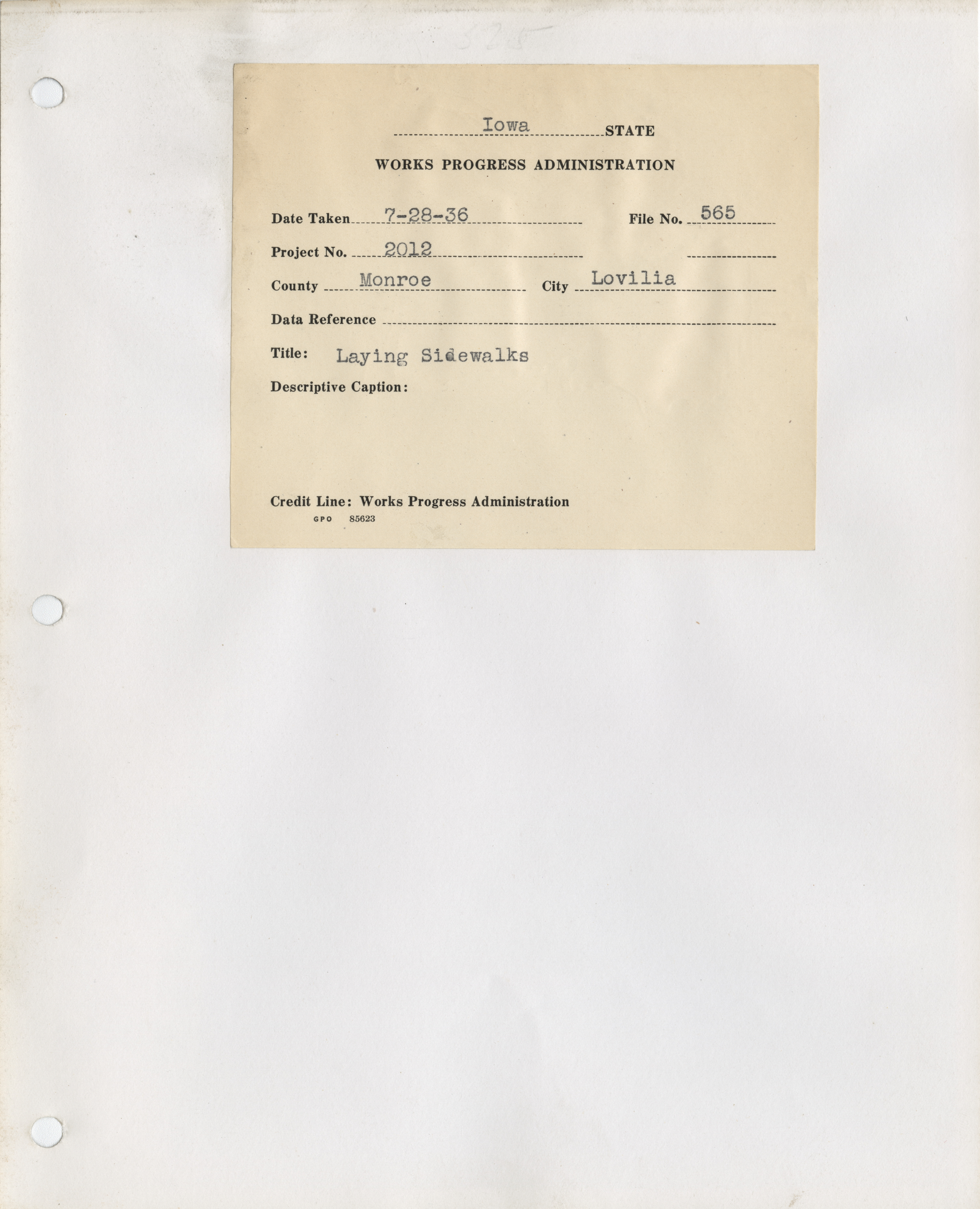 - District 4. Monroe County. Lovilia. Laying Sidewalks. Project 2012. (1 b/w photograph), 1936