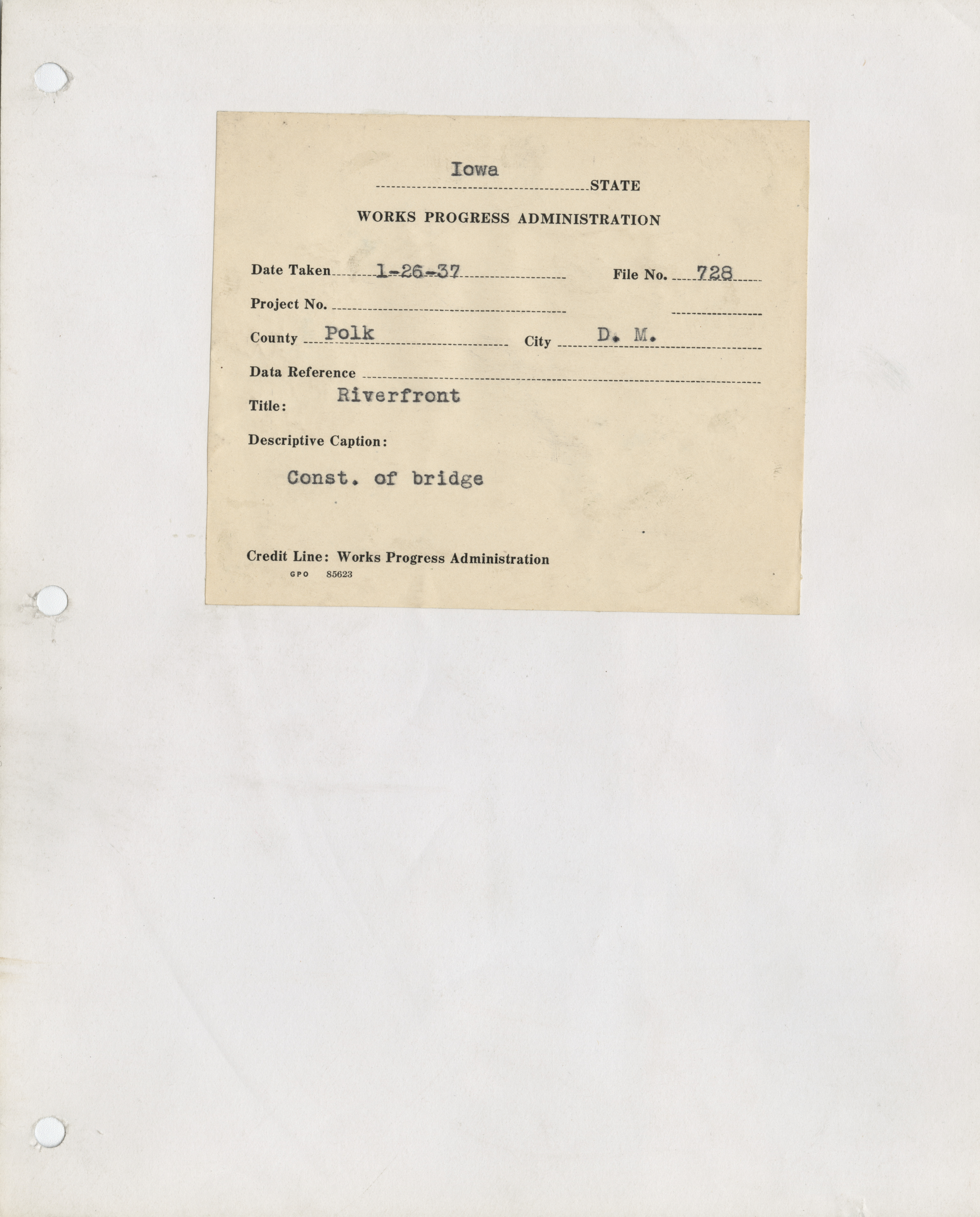 - "Photograph of the construction of a bridge in Des Moines", Work Projects Administration (Iowa) Photographs, Iowa State University Library Digital Collections