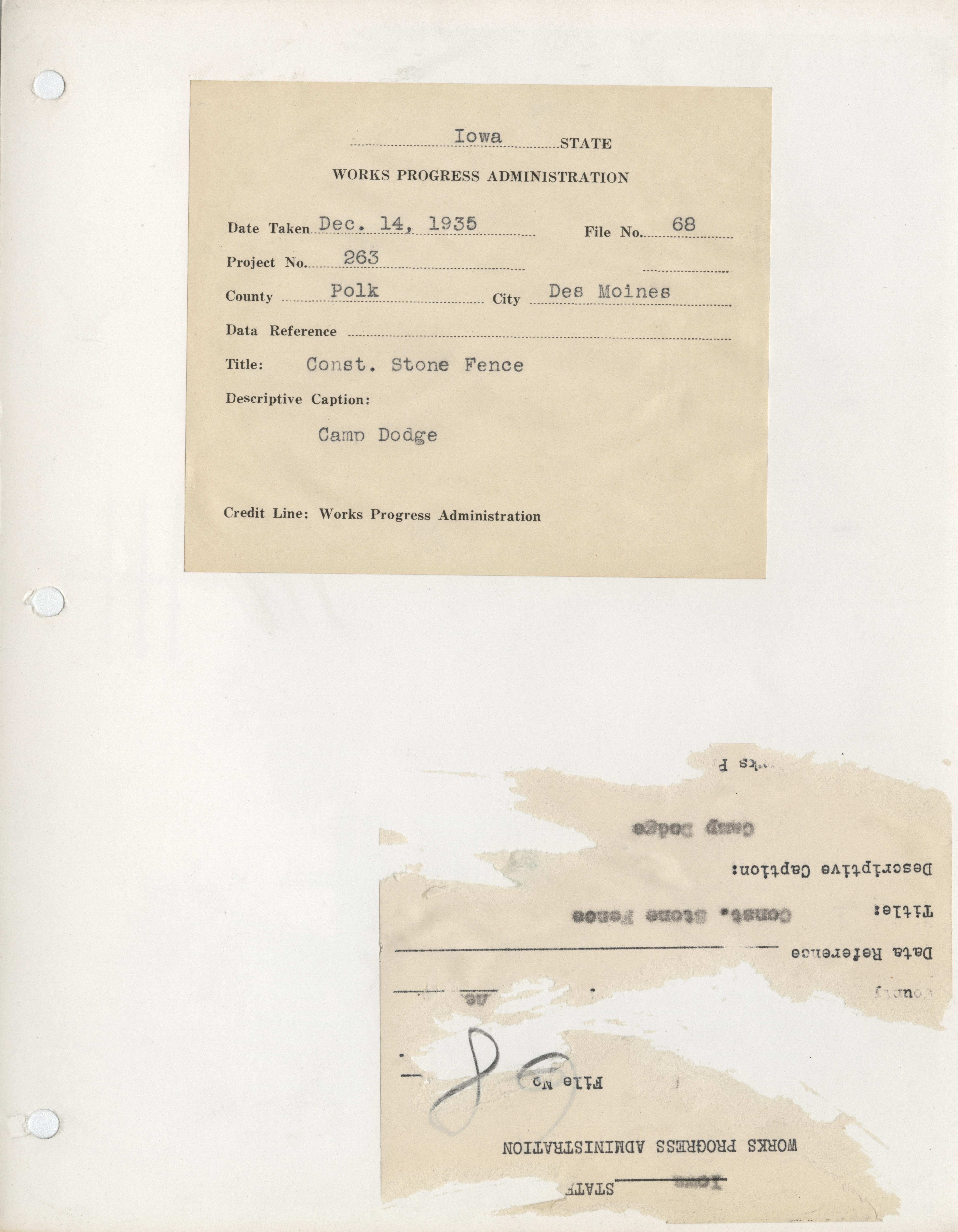 - "Photograph of the construction of a stone fence at Camp Dodge", Work Projects Administration (Iowa) Photographs, Iowa State University Library Digital Collections
