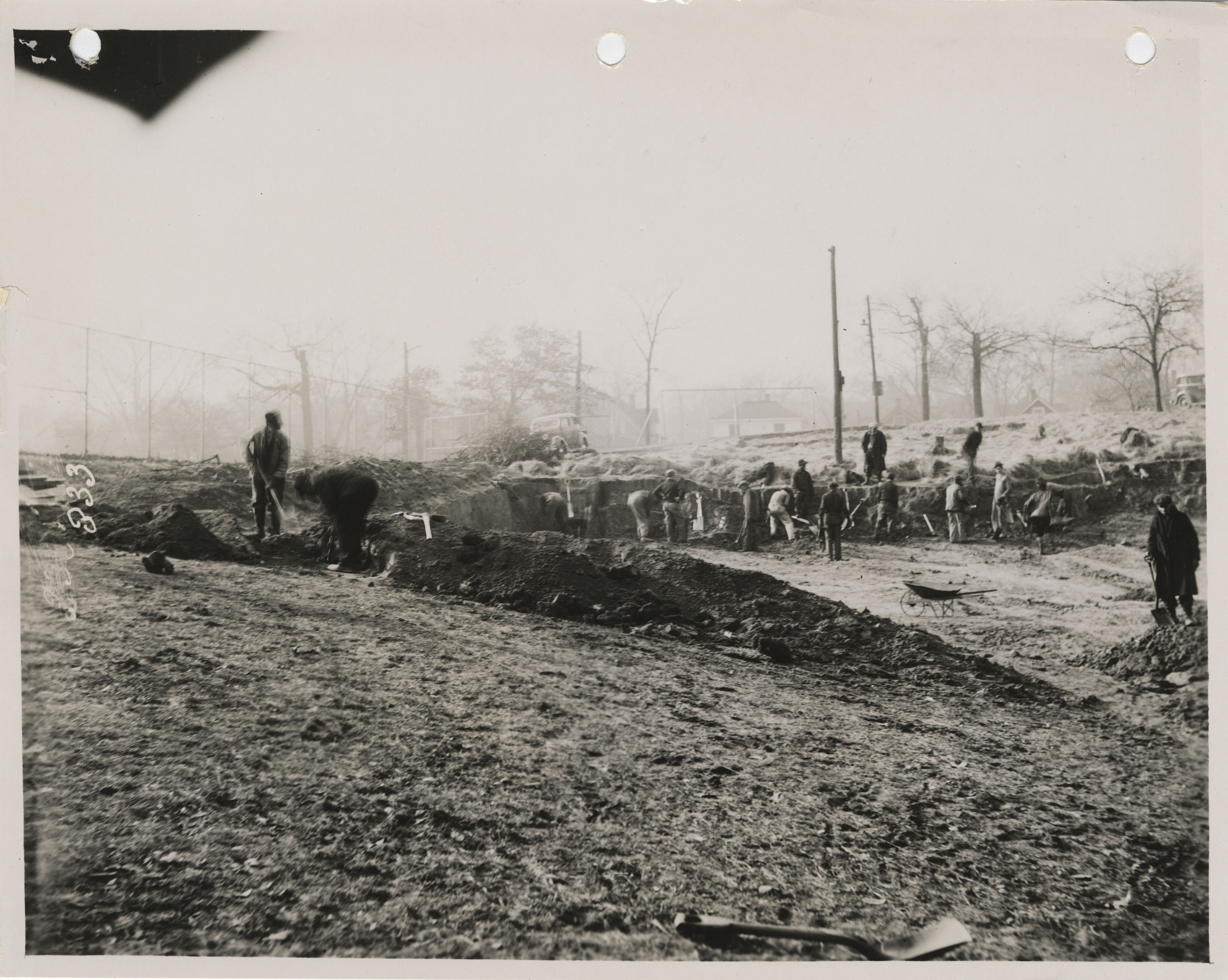 Photograph of people constructing a swimming pool at Good Park in Des Moines Item Info