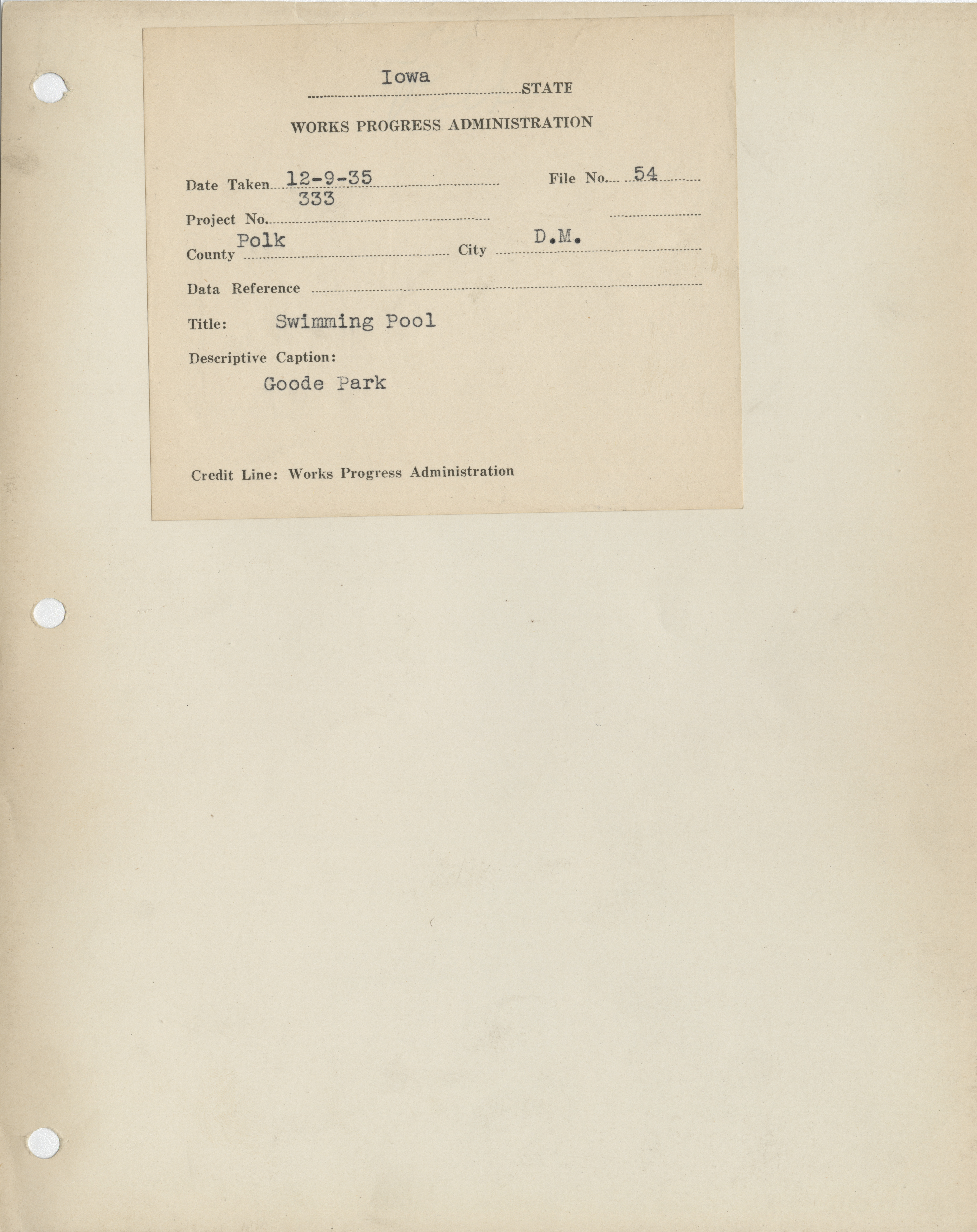 - "Photograph of people constructing a swimming pool at Good Park in Des Moines", Work Projects Administration (Iowa) Photographs, Iowa State University Library Digital Collections