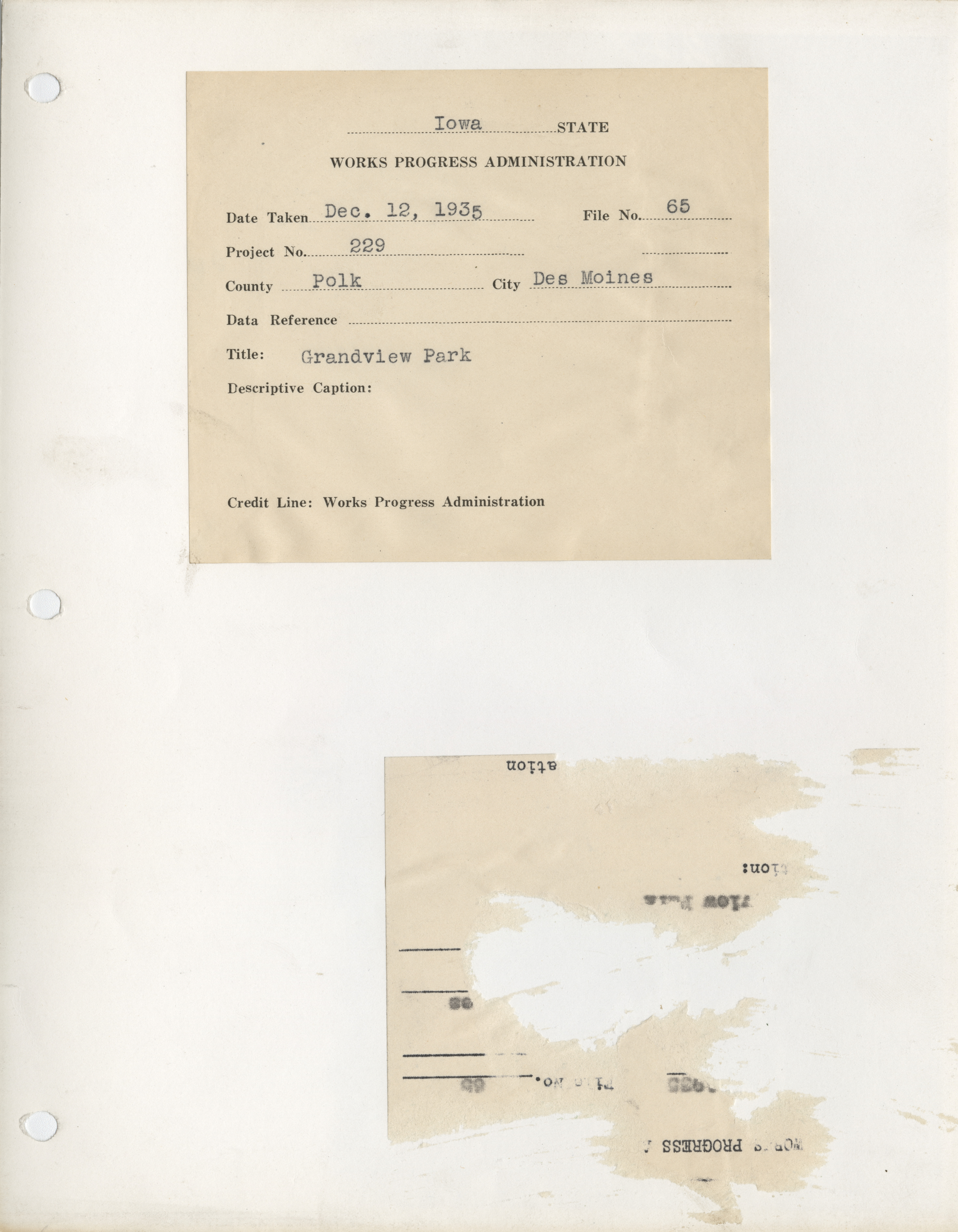 - District 4. Polk County. Des Moines. Grandview Park. Project 229. (1 b/w photograph), 1935