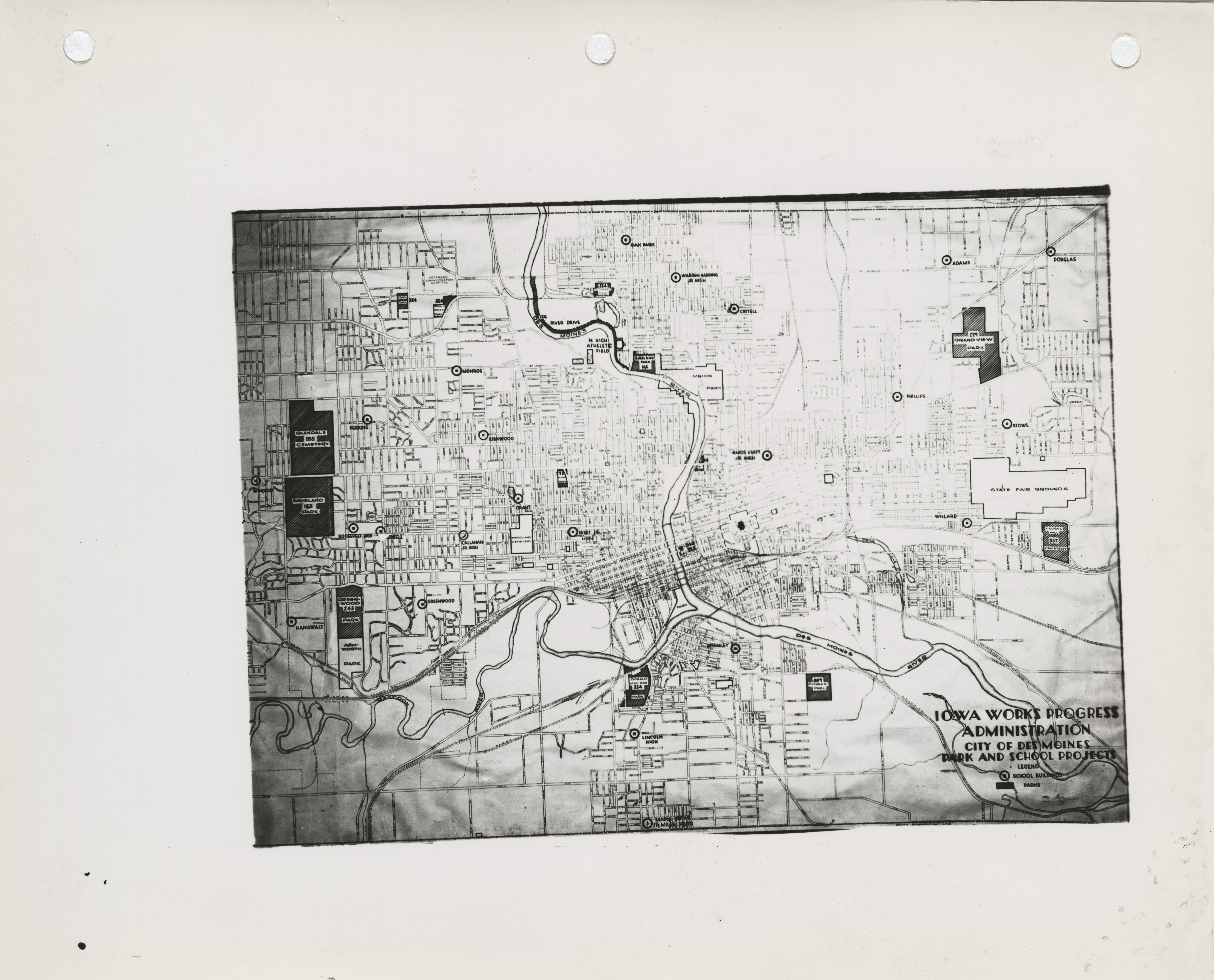 - "Map of park and school projects in Des Moines", Work Projects Administration (Iowa) Photographs, Iowa State University Library Digital Collections