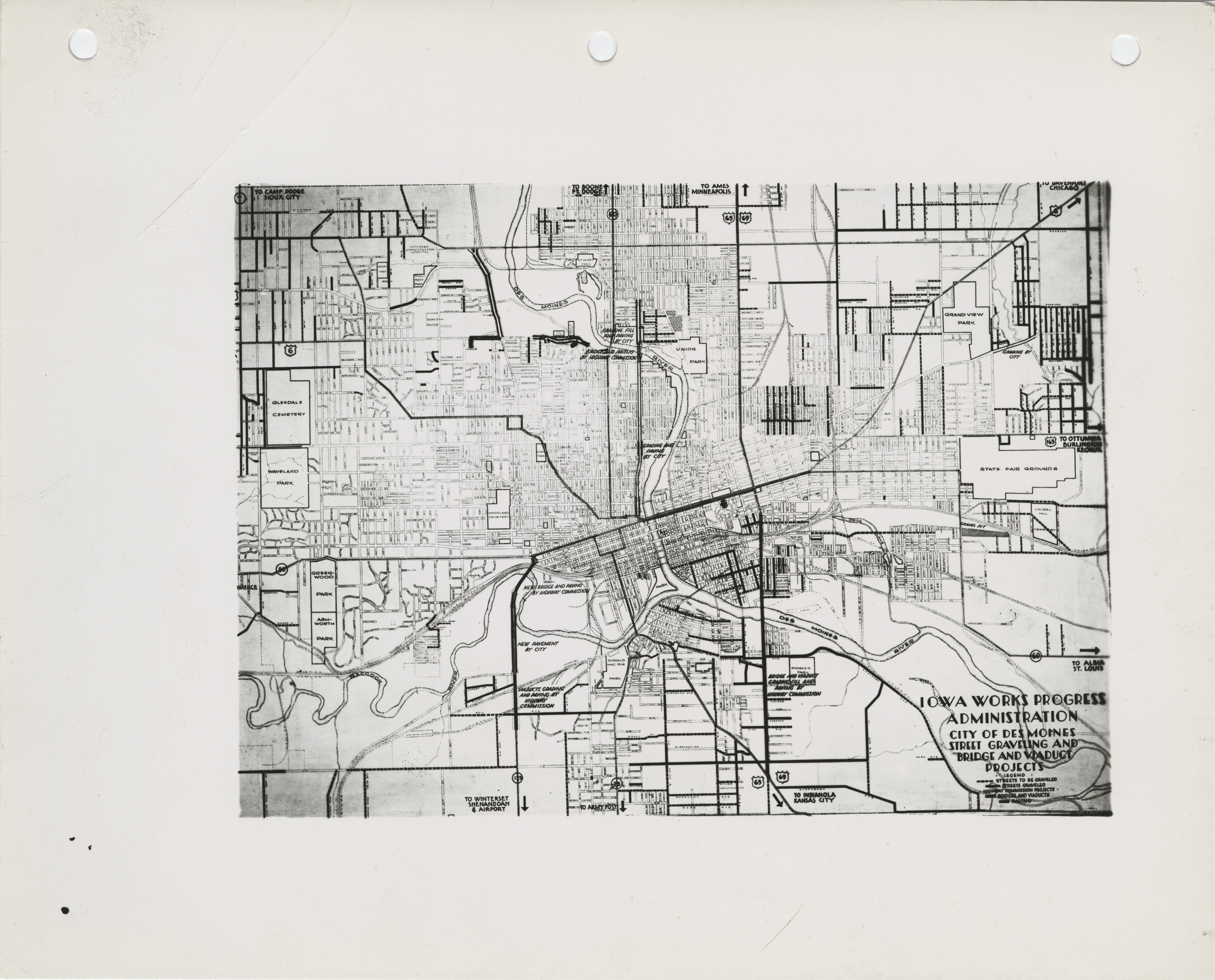 - "Map of street, bridge, and viaduct projects in Des Moines", Work Projects Administration (Iowa) Photographs, Iowa State University Library Digital Collections