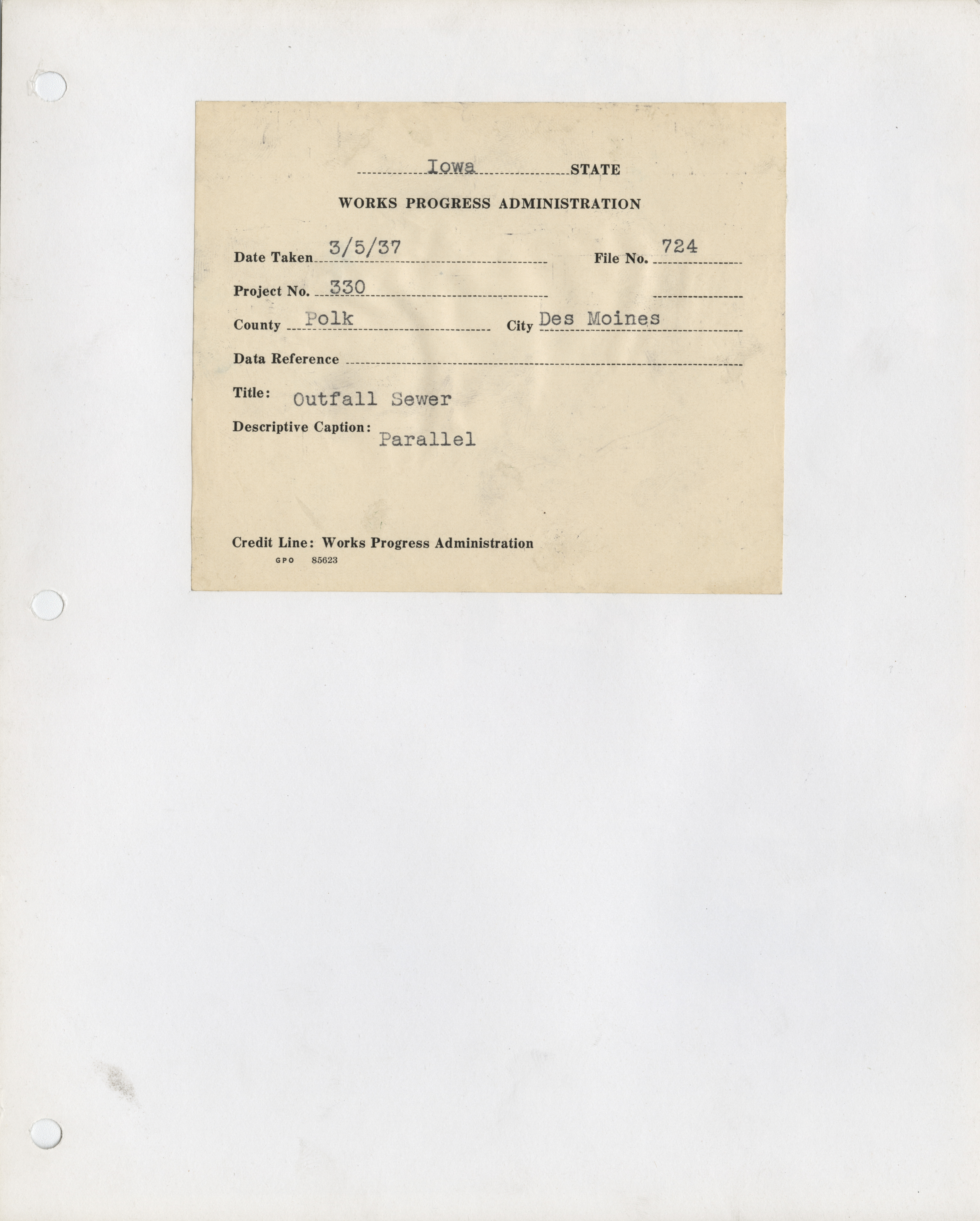 - "Photograph of the construction of an outfall sewer in Des Moines", Work Projects Administration (Iowa) Photographs, Iowa State University Library Digital Collections