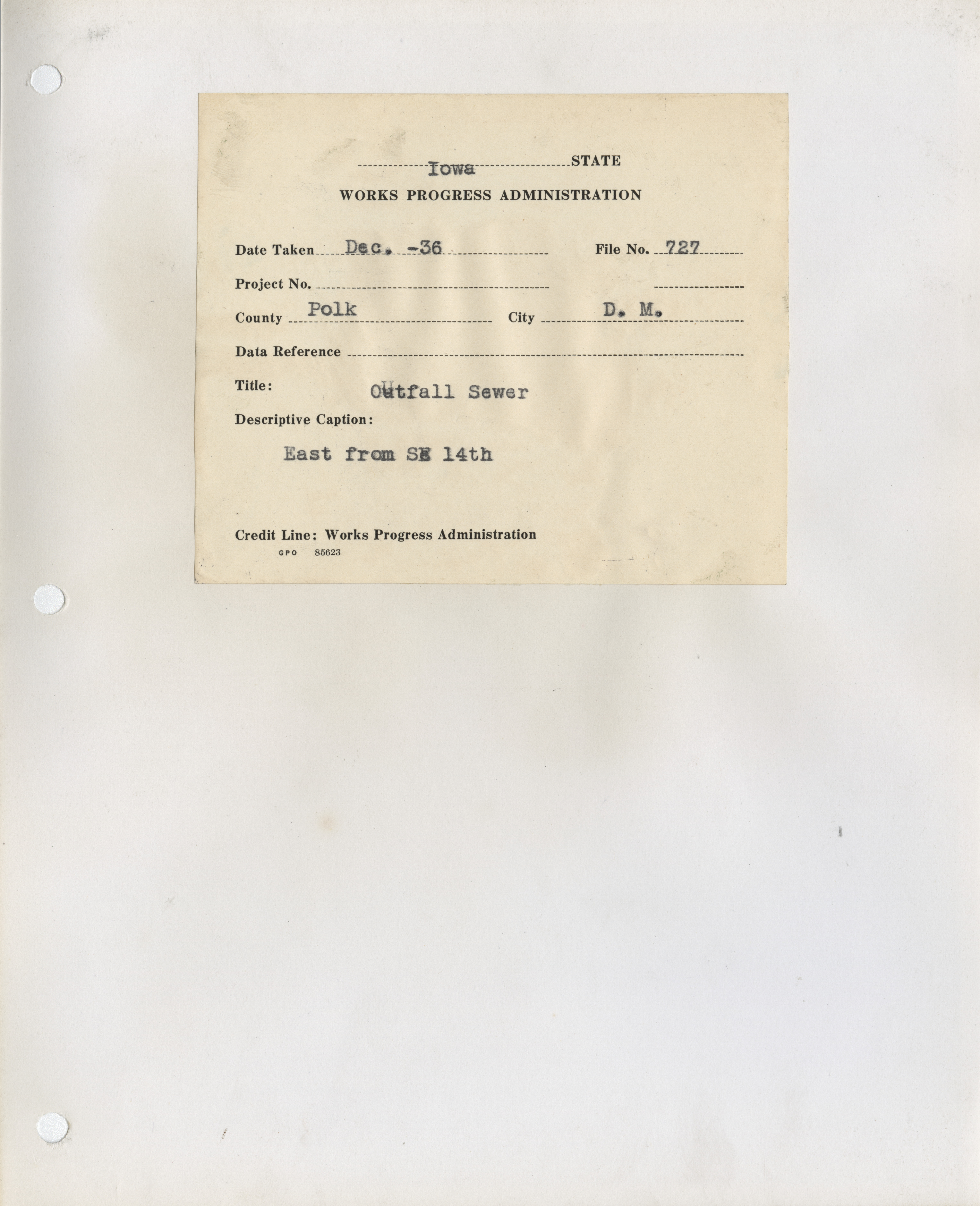 - "Photograph of the construction of an outfall sewer at SE 14th St. in Des Moines", Work Projects Administration (Iowa) Photographs, Iowa State University Library Digital Collections