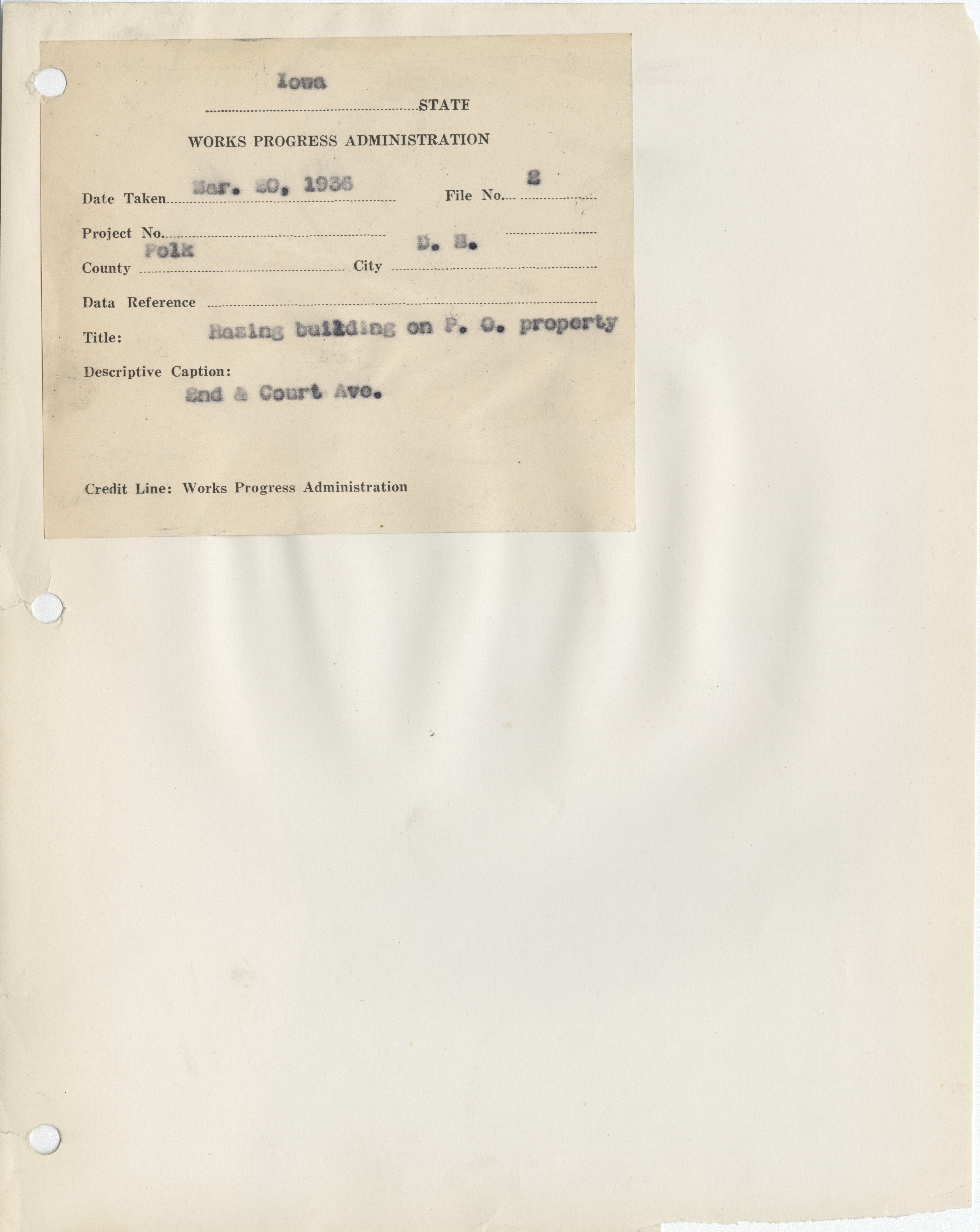 - "Photograph of a building being razed on 2nd and Court Ave. in Des Moines", Work Projects Administration (Iowa) Photographs, Iowa State University Library Digital Collections
