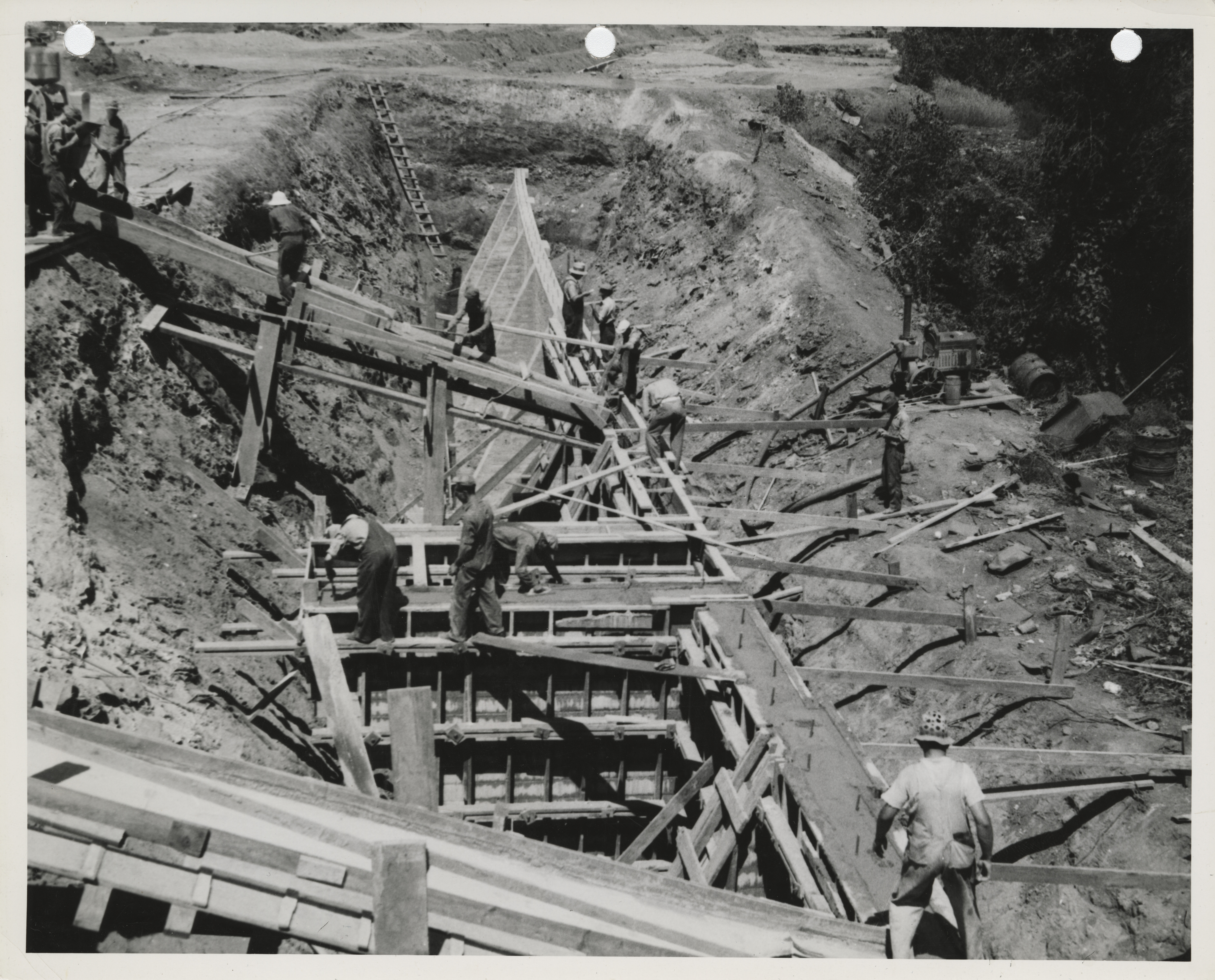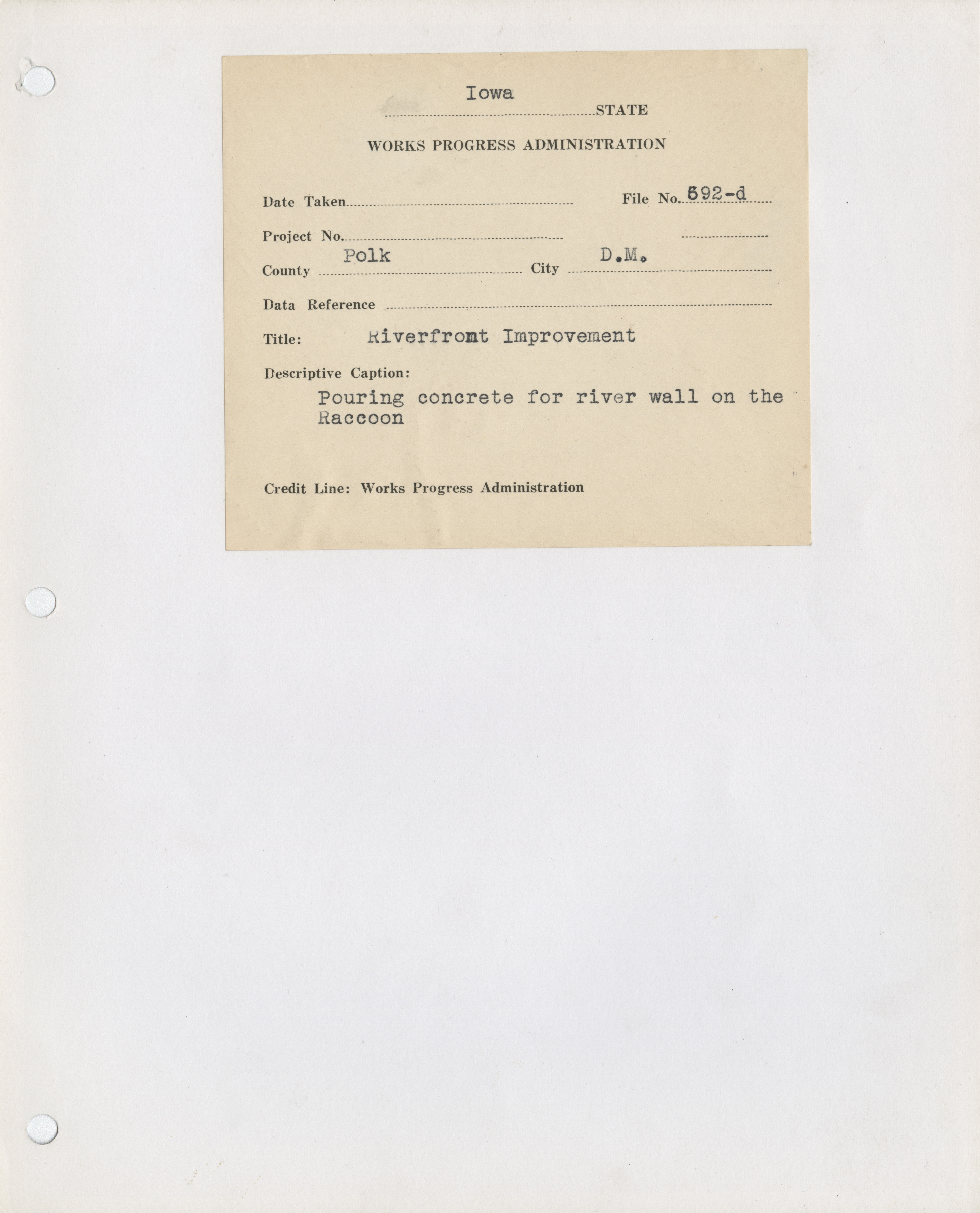 - "Photograph of people pouring concrete for a river wall on the Raccoon River in Des Moines", Work Projects Administration (Iowa) Photographs, Iowa State University Library Digital Collections