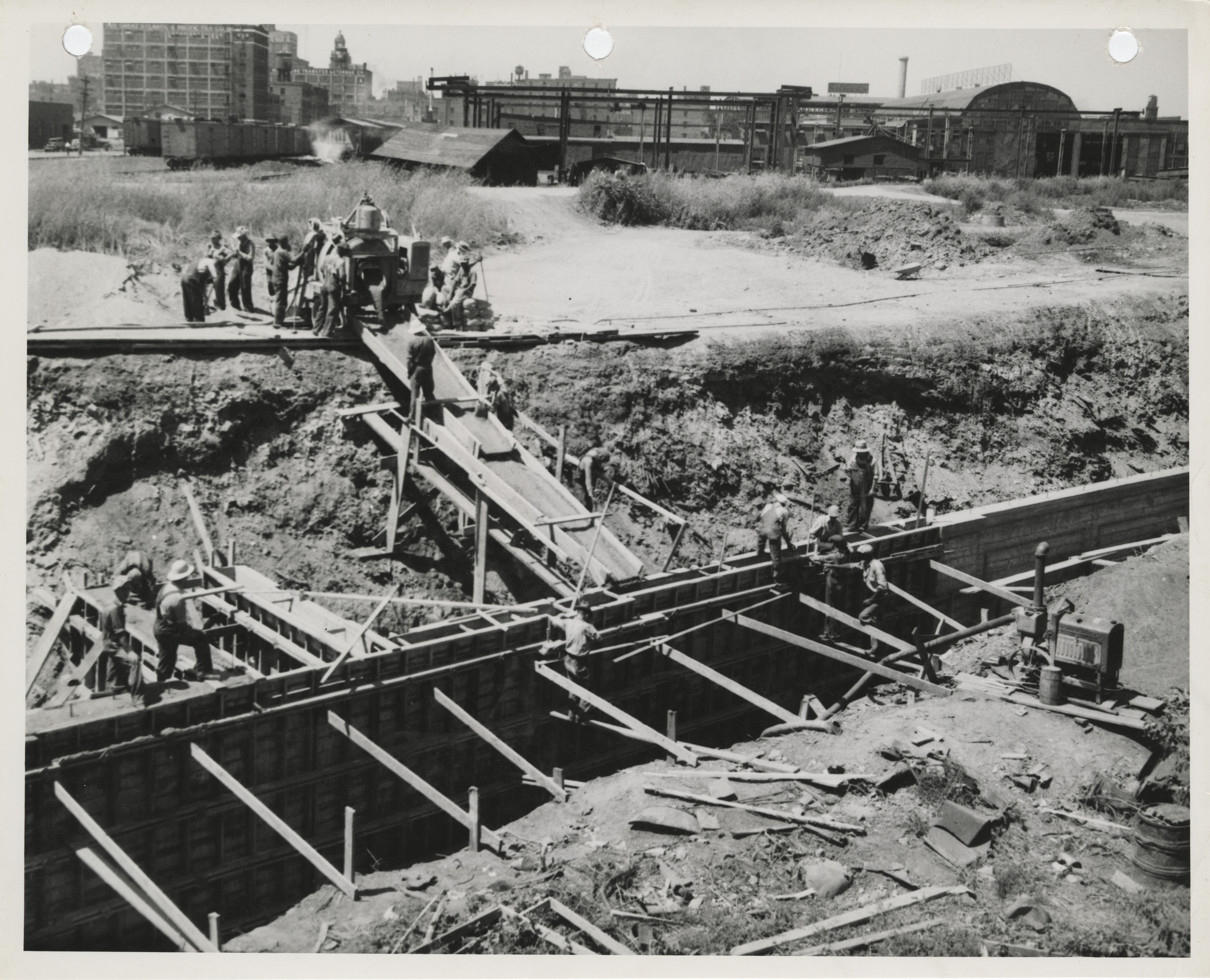 - Photograph of people pouring concrete for a river wall on the Raccoon River in Des Moines