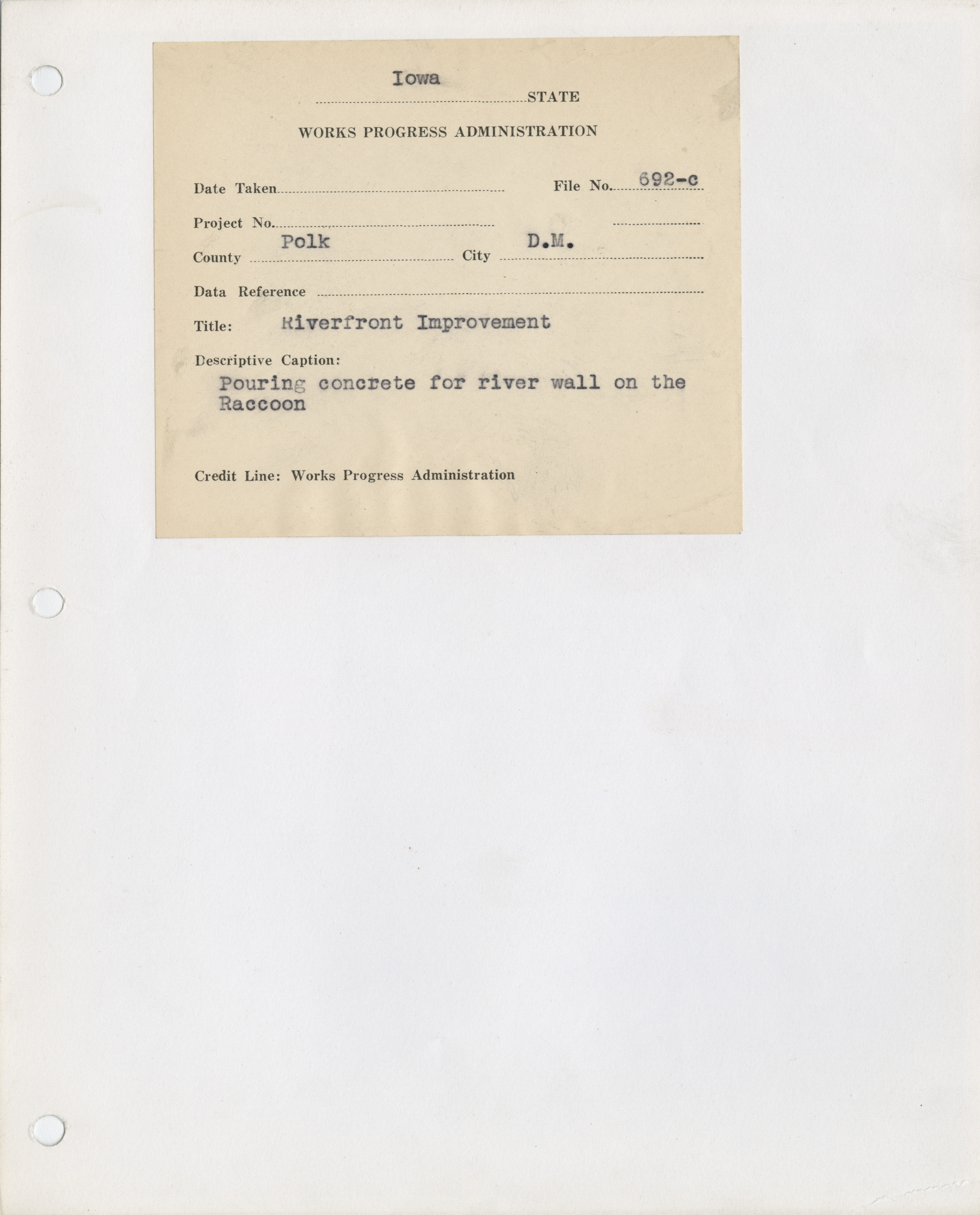 - "Photograph of people pouring concrete for a river wall on the Raccoon River in Des Moines", Work Projects Administration (Iowa) Photographs, Iowa State University Library Digital Collections