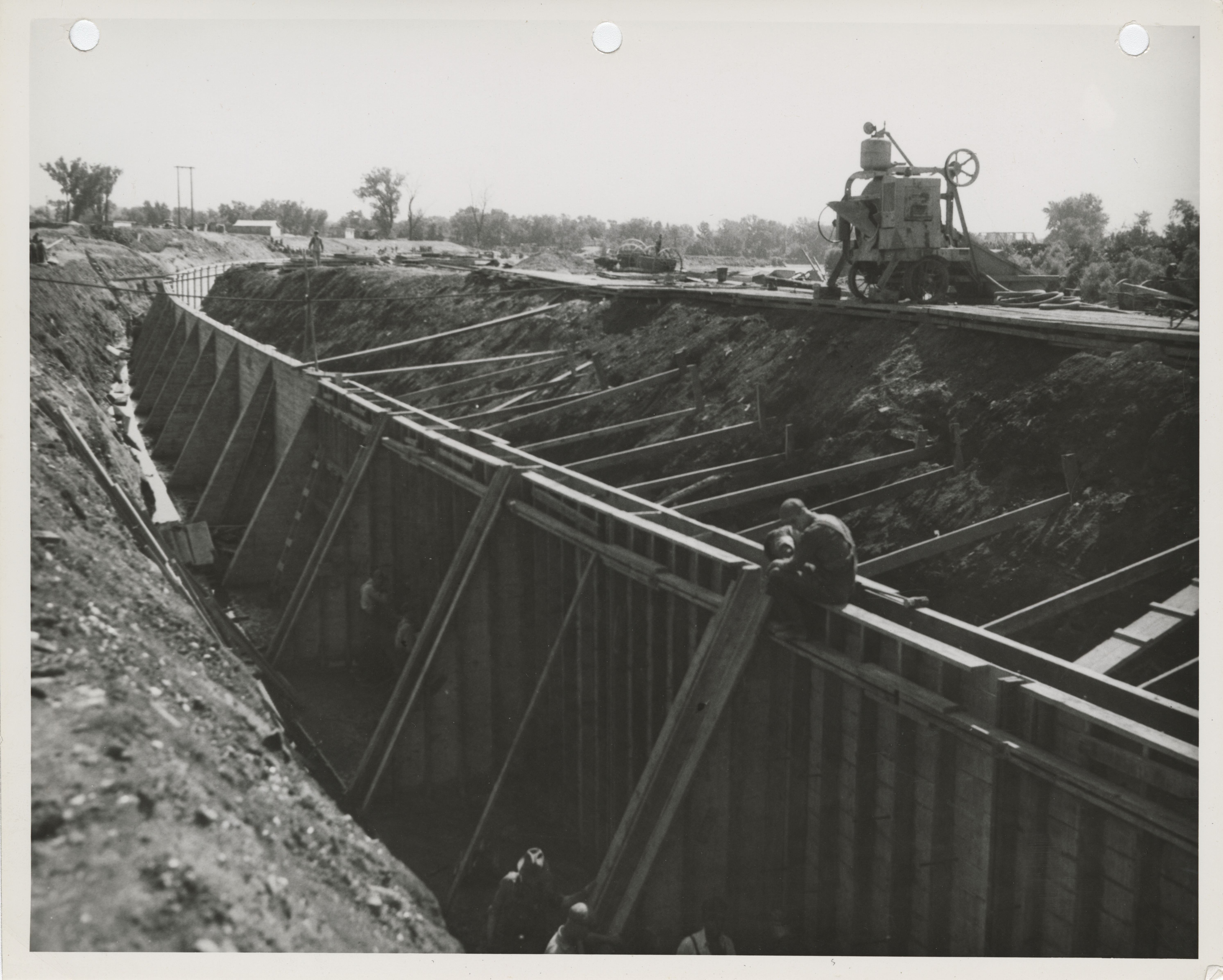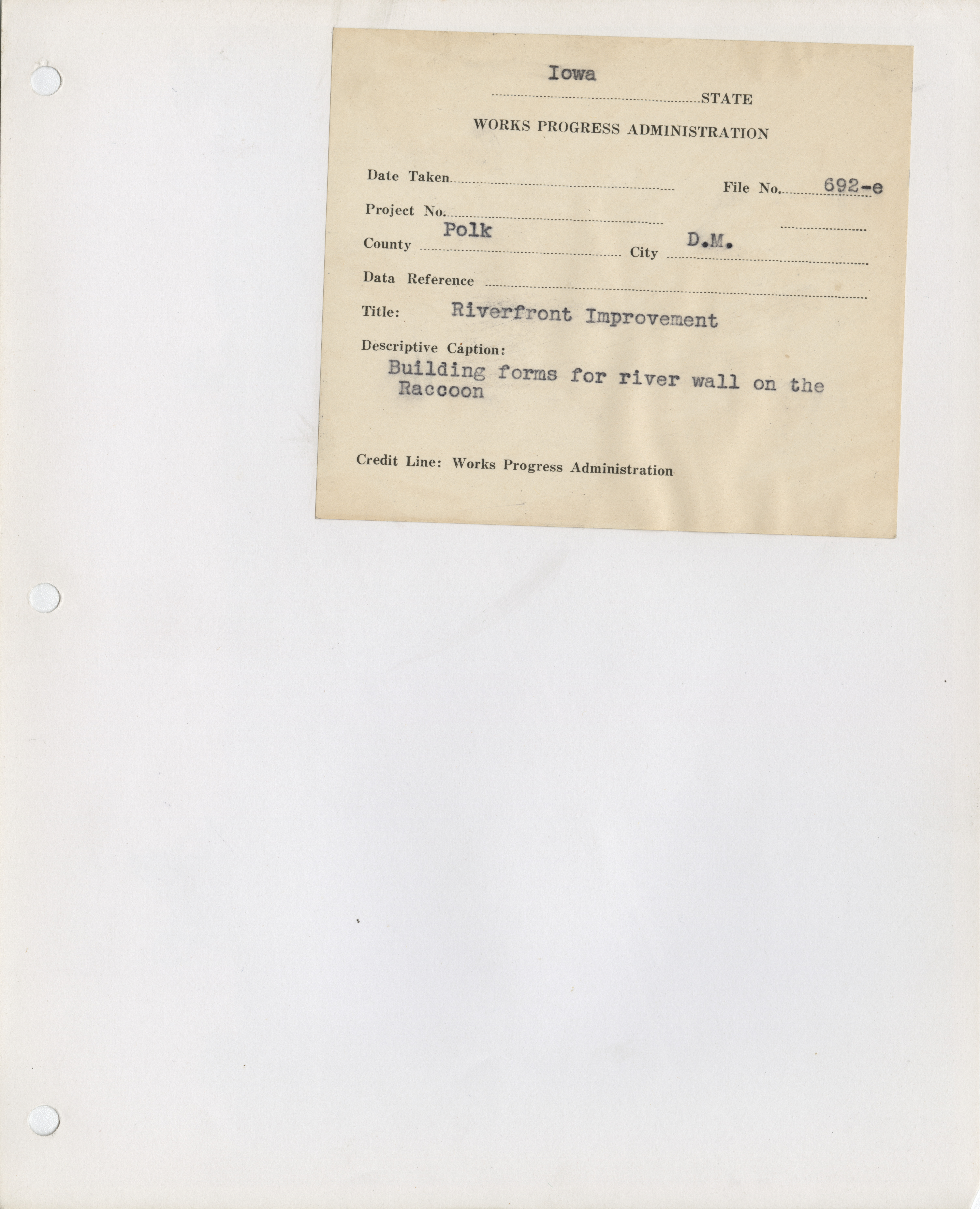 - "Photograph of people building forms for a river wall on the Raccoon River in Des Moines", Work Projects Administration (Iowa) Photographs, Iowa State University Library Digital Collections