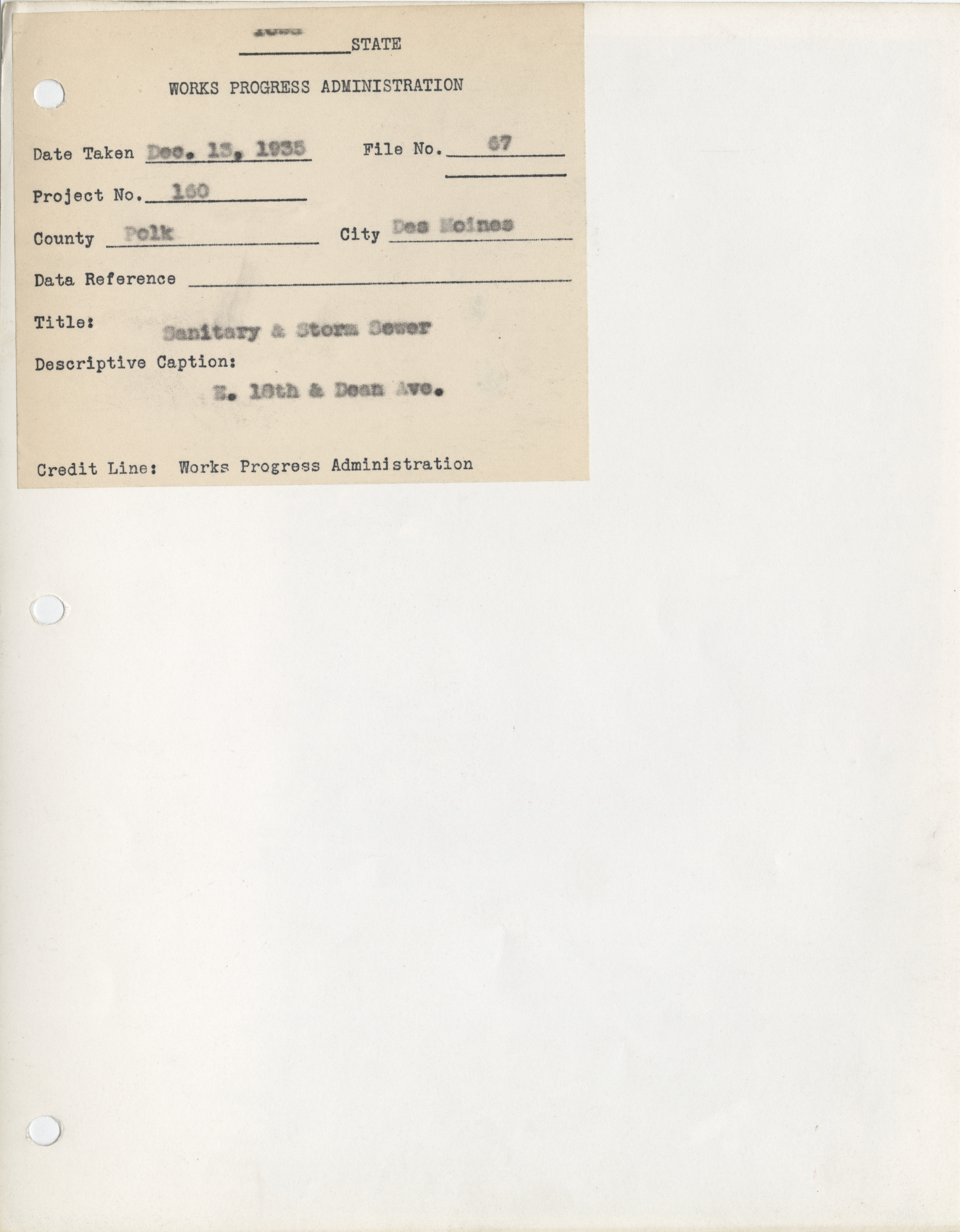- District 4. Polk County. Des Moines. Sewer, East 18th and Dean Avenue. Project 160 (1 b/w photograph), 1935