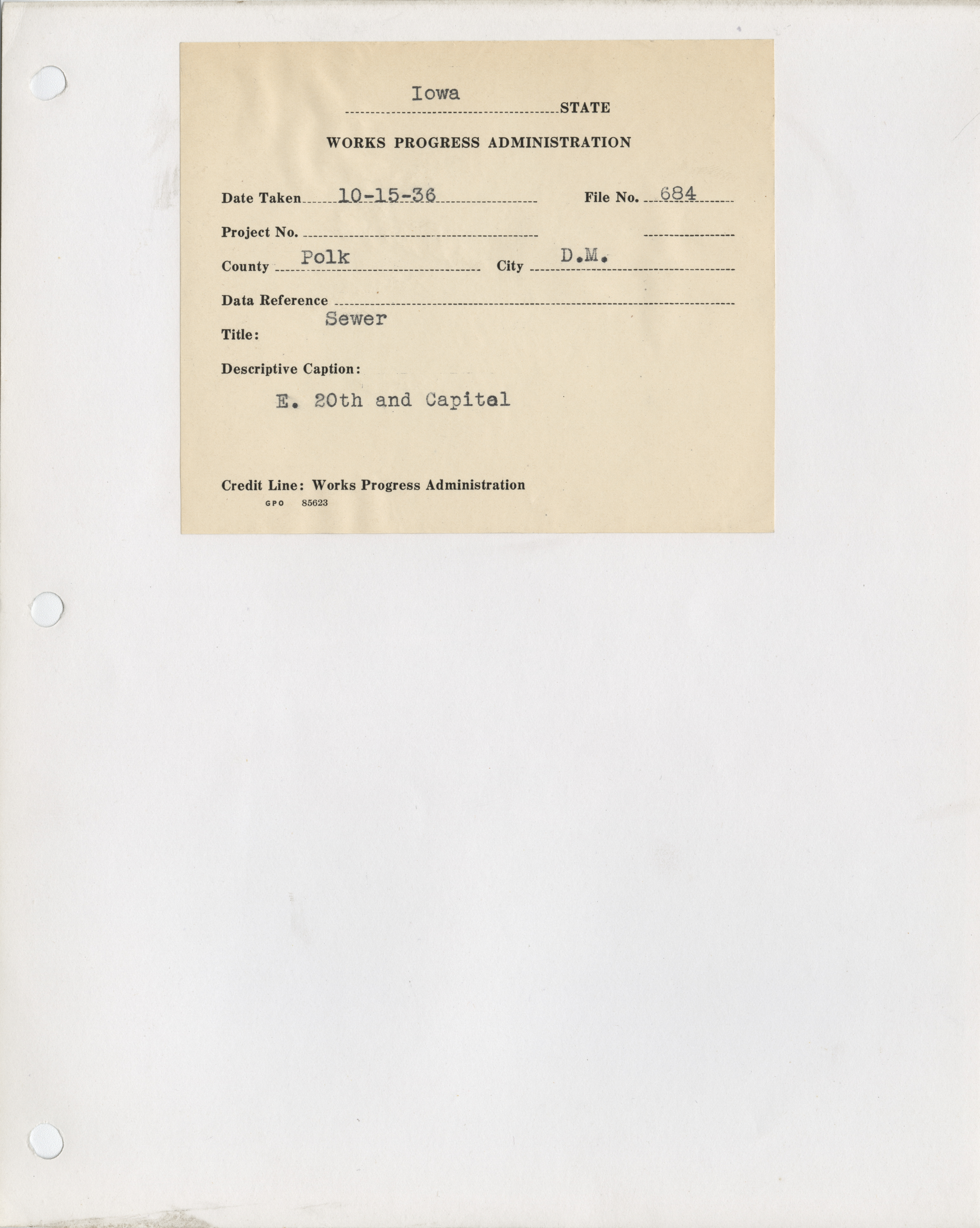- "Photograph of people constructing a sewer at E 20th and Capitol in Des Moines", Work Projects Administration (Iowa) Photographs, Iowa State University Library Digital Collections