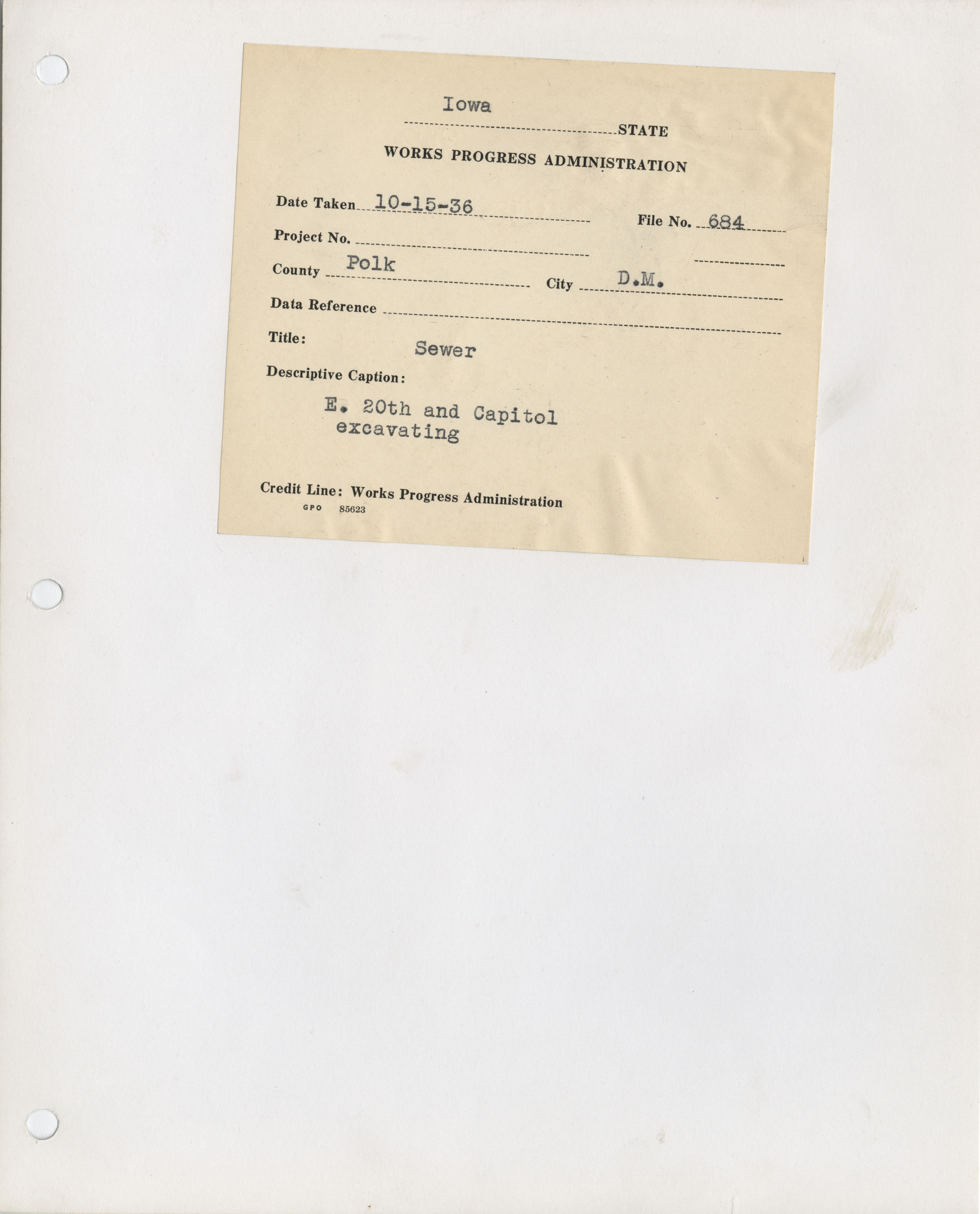 - "Photograph of people excavating for a sewer at E 20th and Capitol in Des Moines", Work Projects Administration (Iowa) Photographs, Iowa State University Library Digital Collections