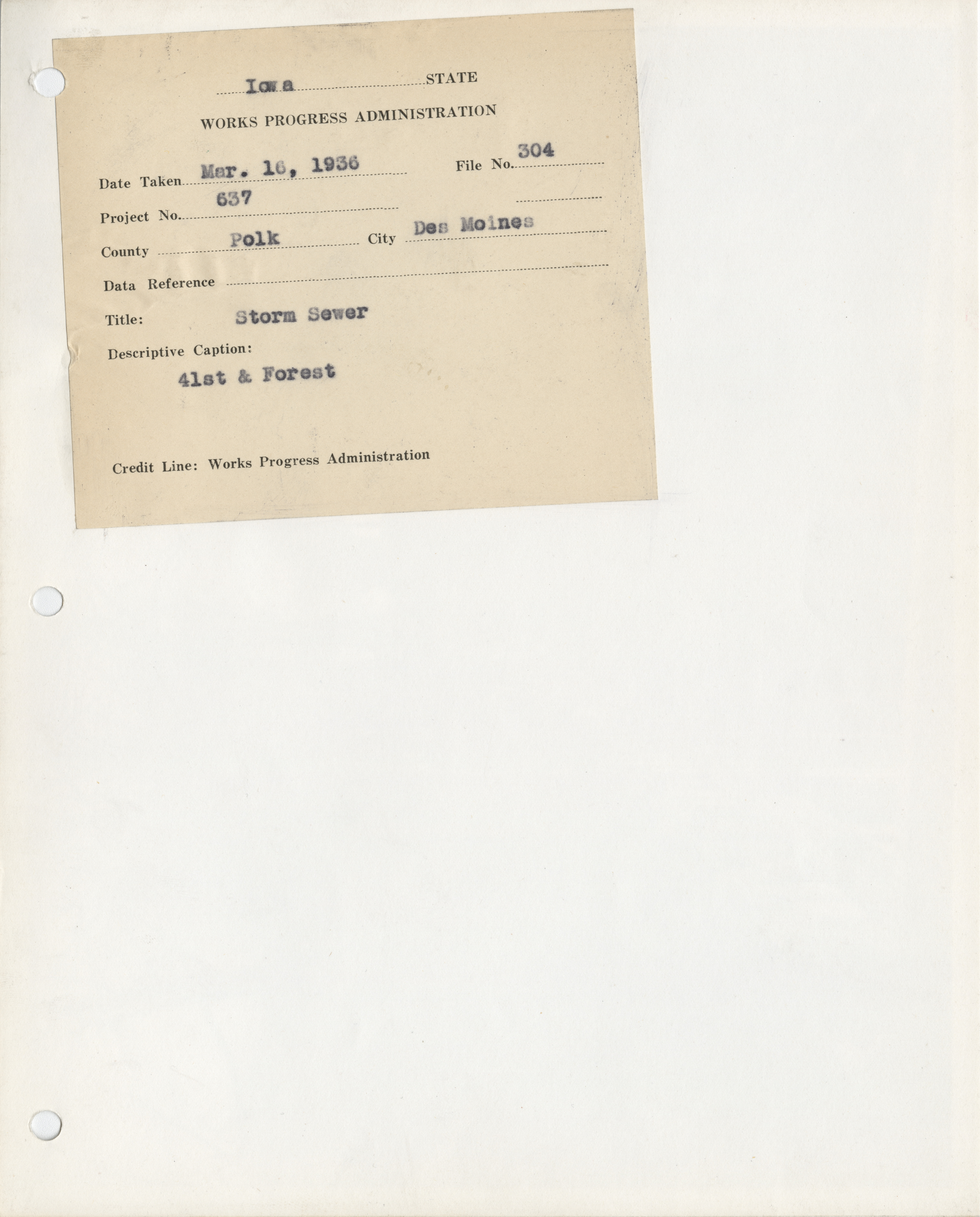 - "Photograph of the construction of a storm sewer at 41st and Forest in Des Moines", Work Projects Administration (Iowa) Photographs, Iowa State University Library Digital Collections