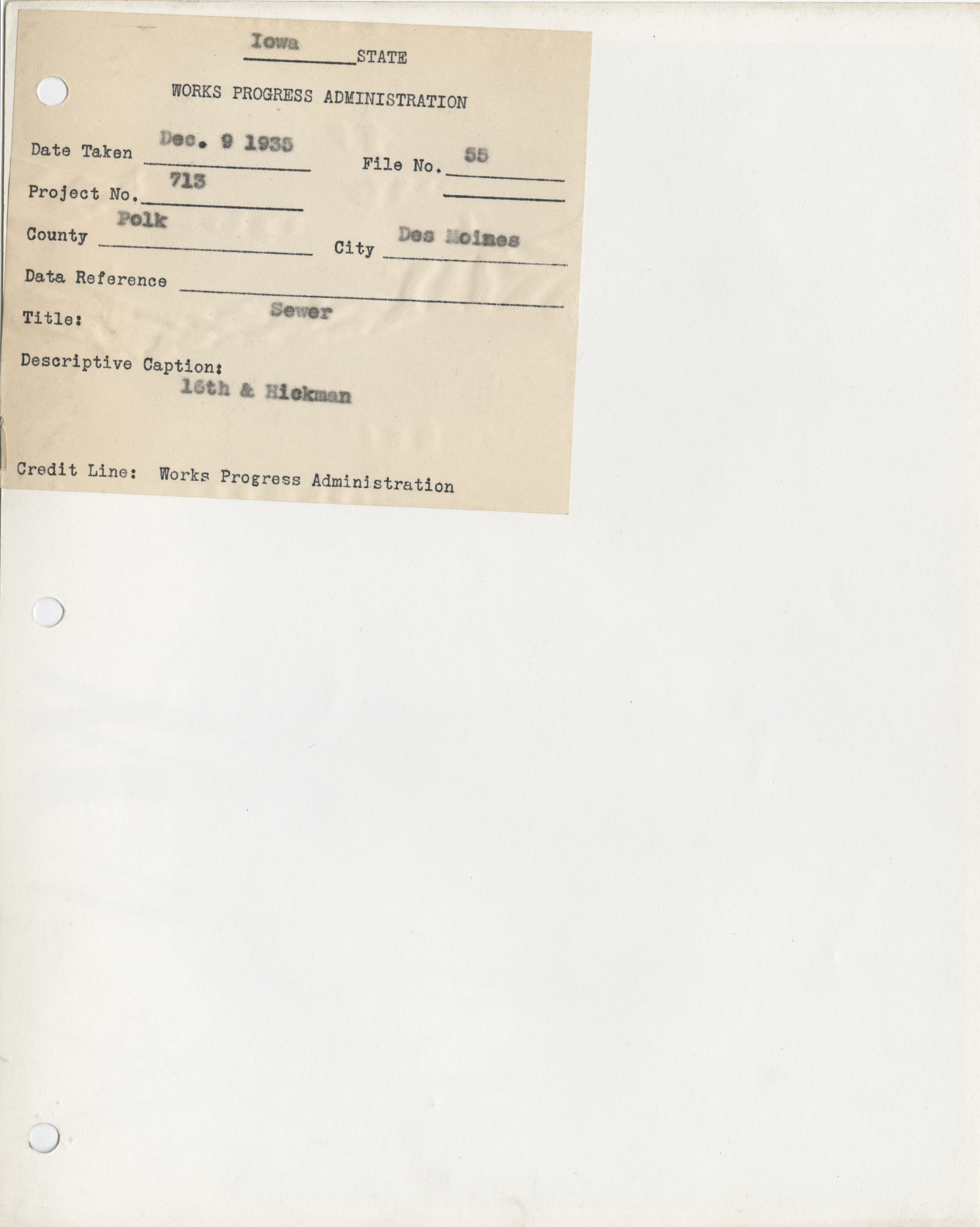 - District 4. Polk County. Des Moines. Sewer, 16th and Hickman. Project 713. (1 b/w photograph), 1935