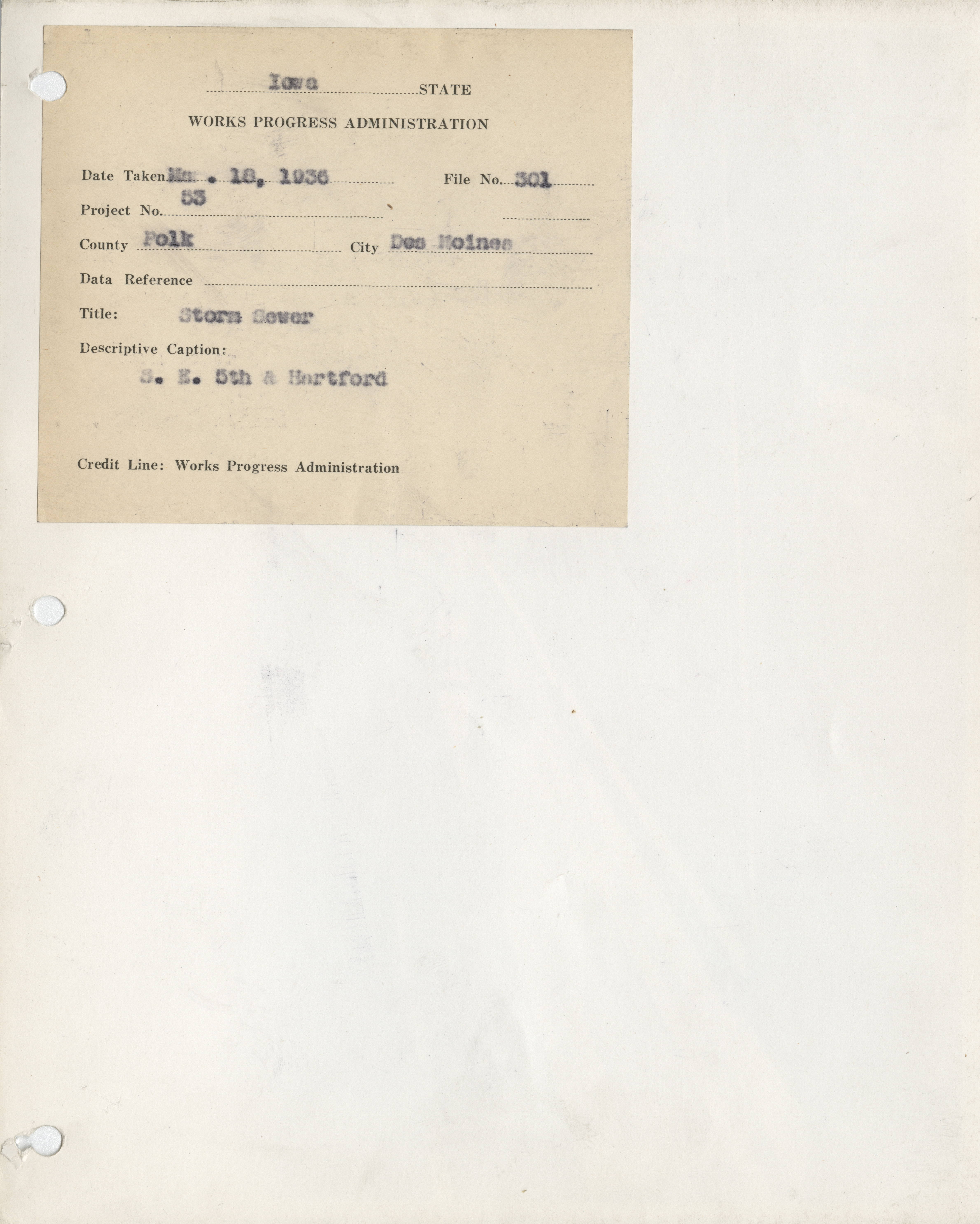 - "Photograph of people constructing a storm sewer at SE 5th and Hartford in Des Moines", Work Projects Administration (Iowa) Photographs, Iowa State University Library Digital Collections