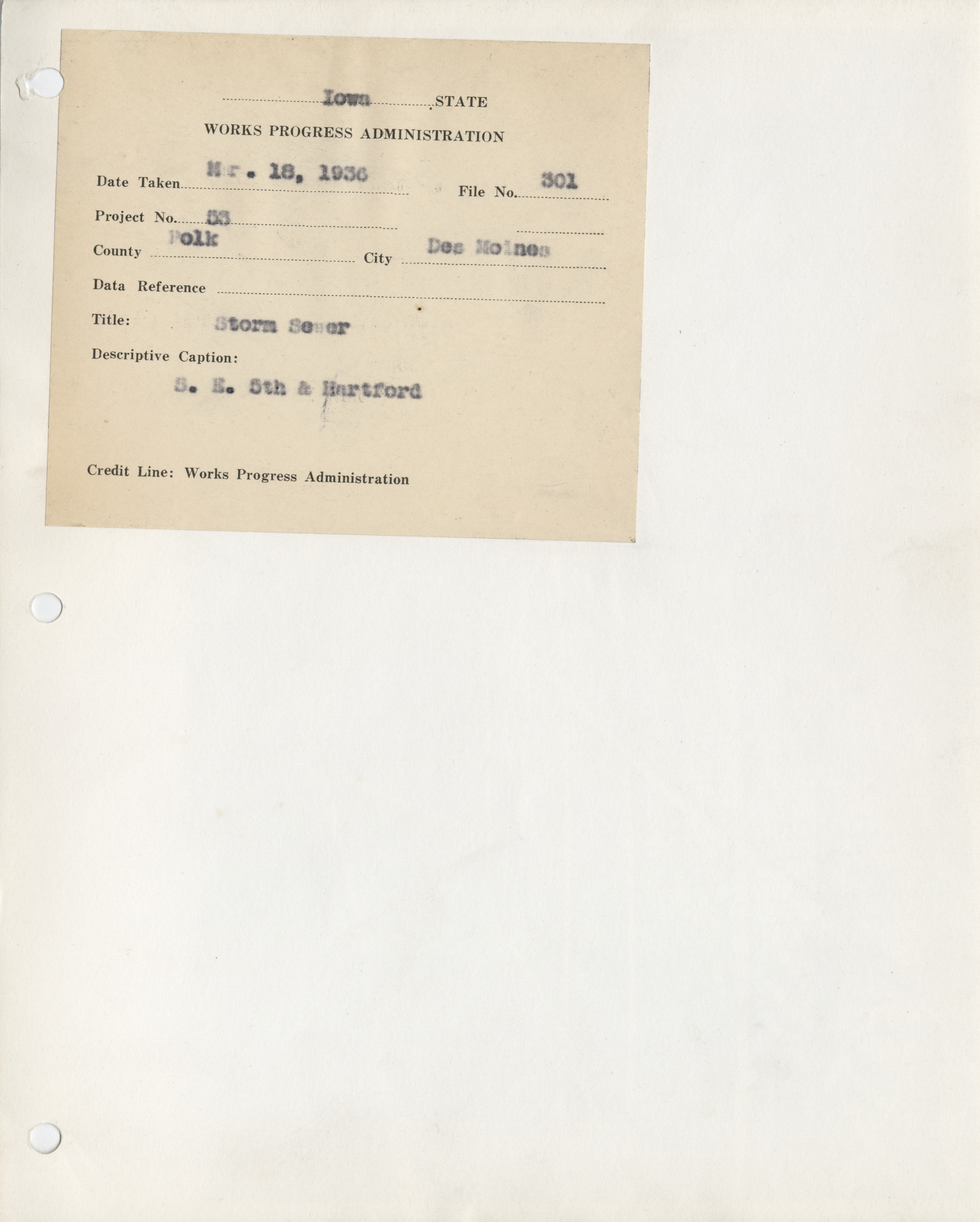- "Photograph of storm sewer construction at SE 5th and Hartford in Des Moines", Work Projects Administration (Iowa) Photographs, Iowa State University Library Digital Collections