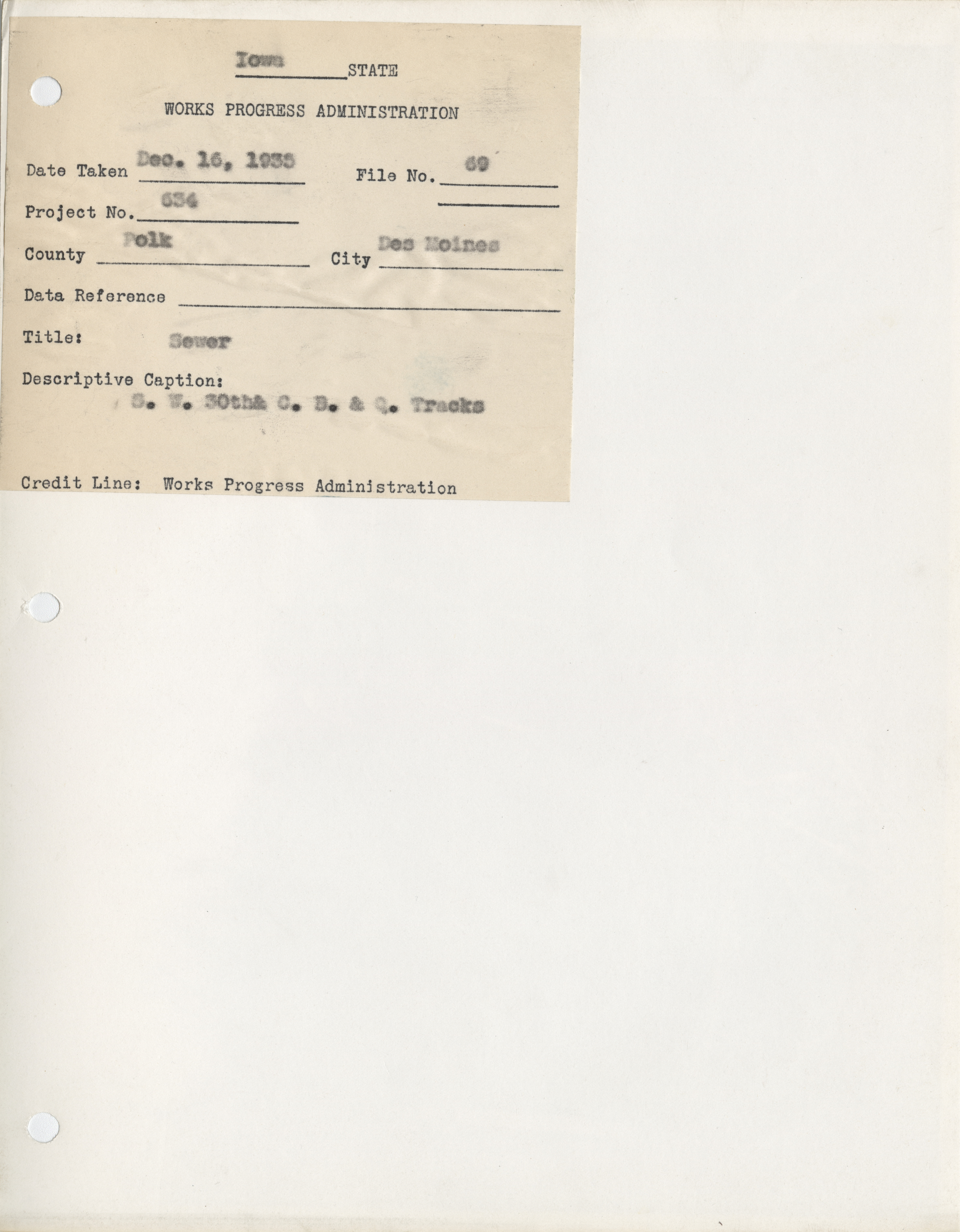 - "Photograph of people constructing a sewer at SW 30th and the CB&Q Railroad tracks in Des Moines", Work Projects Administration (Iowa) Photographs, Iowa State University Library Digital Collections