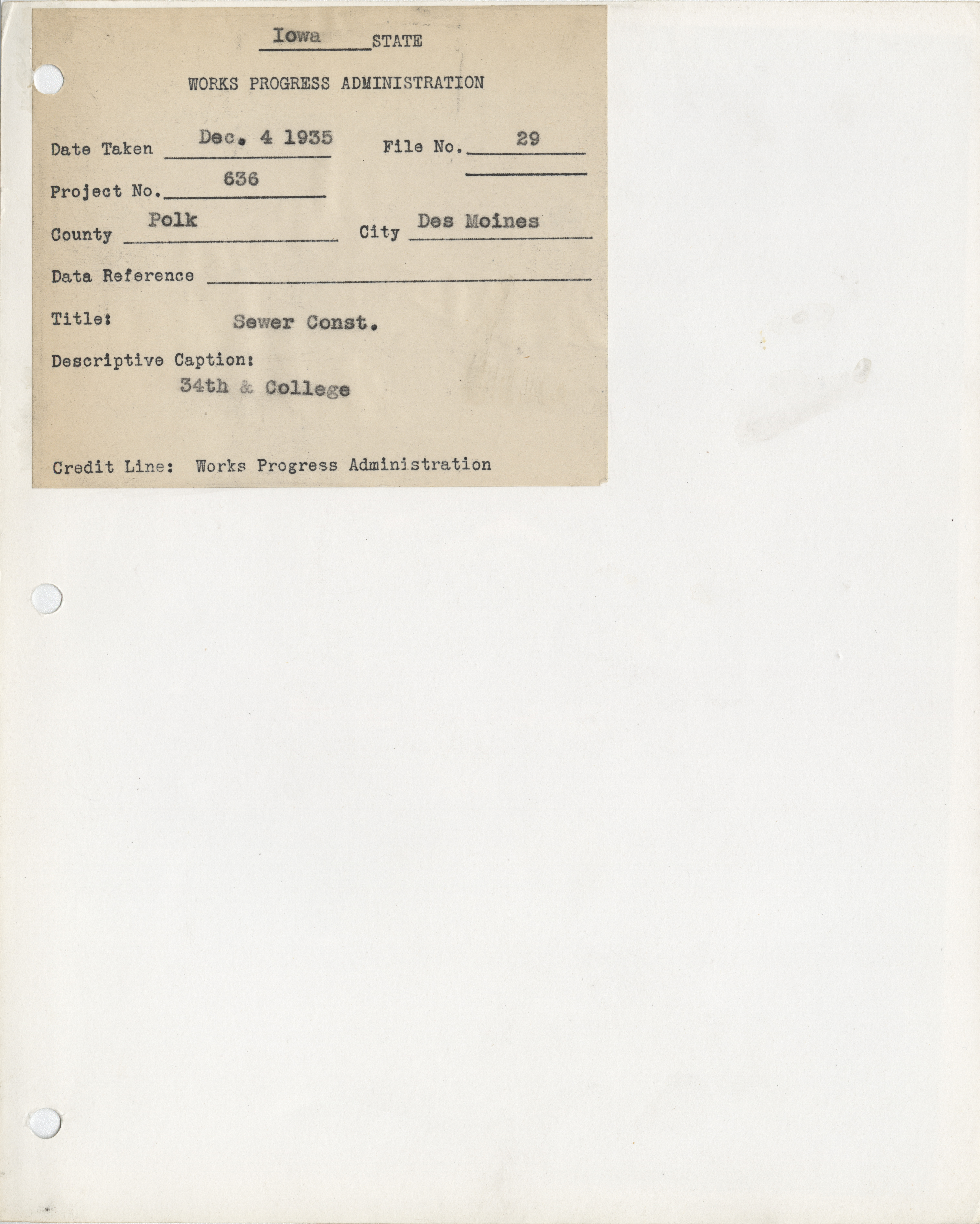 - "Photograph of people constructing a sewer at 34th and College in Des Moines", Work Projects Administration (Iowa) Photographs, Iowa State University Library Digital Collections