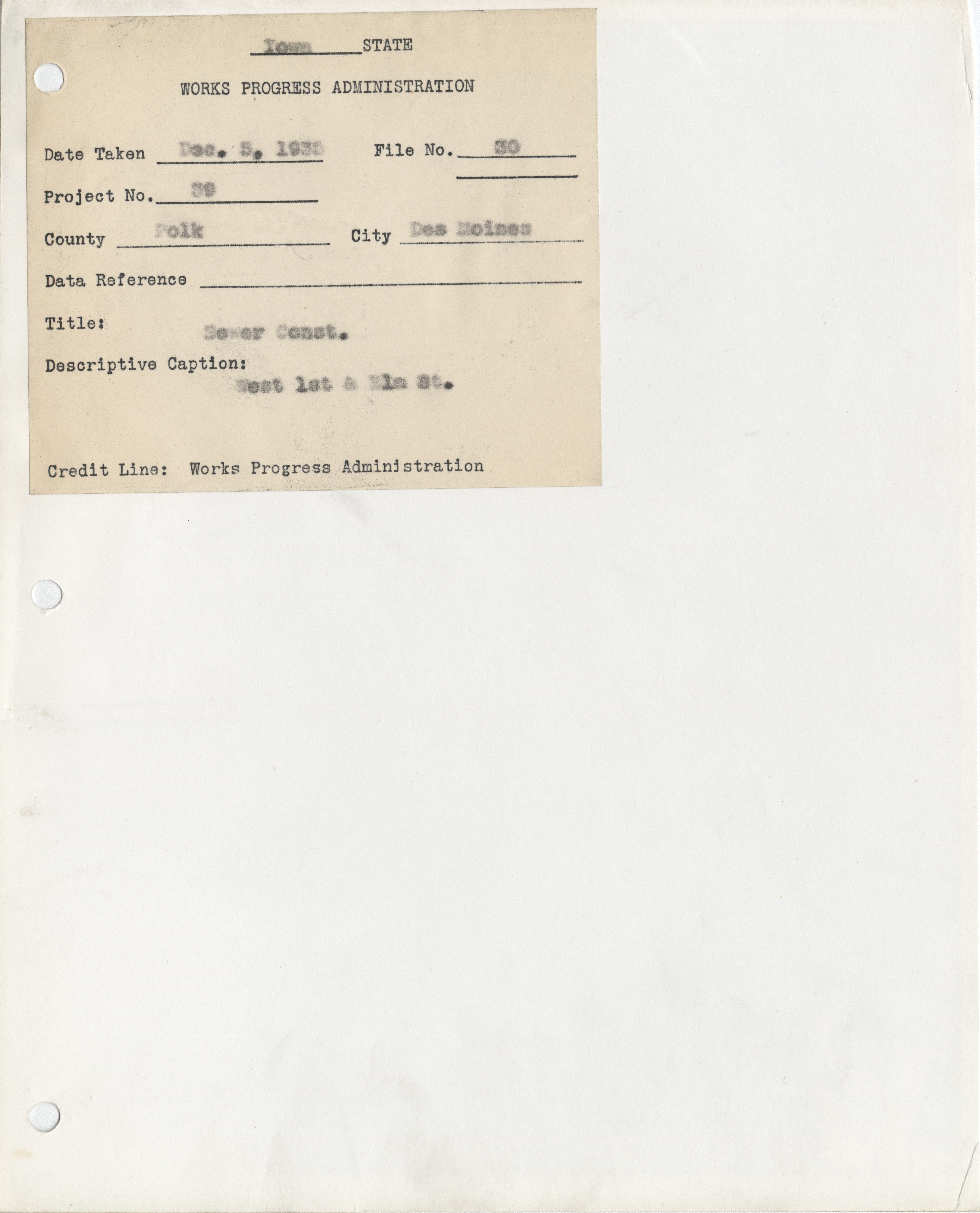 - District 4. Polk County. Des Moines. Sewer, West 1st and Elm Street. Project 39. (1 b/w photograph), 1935
