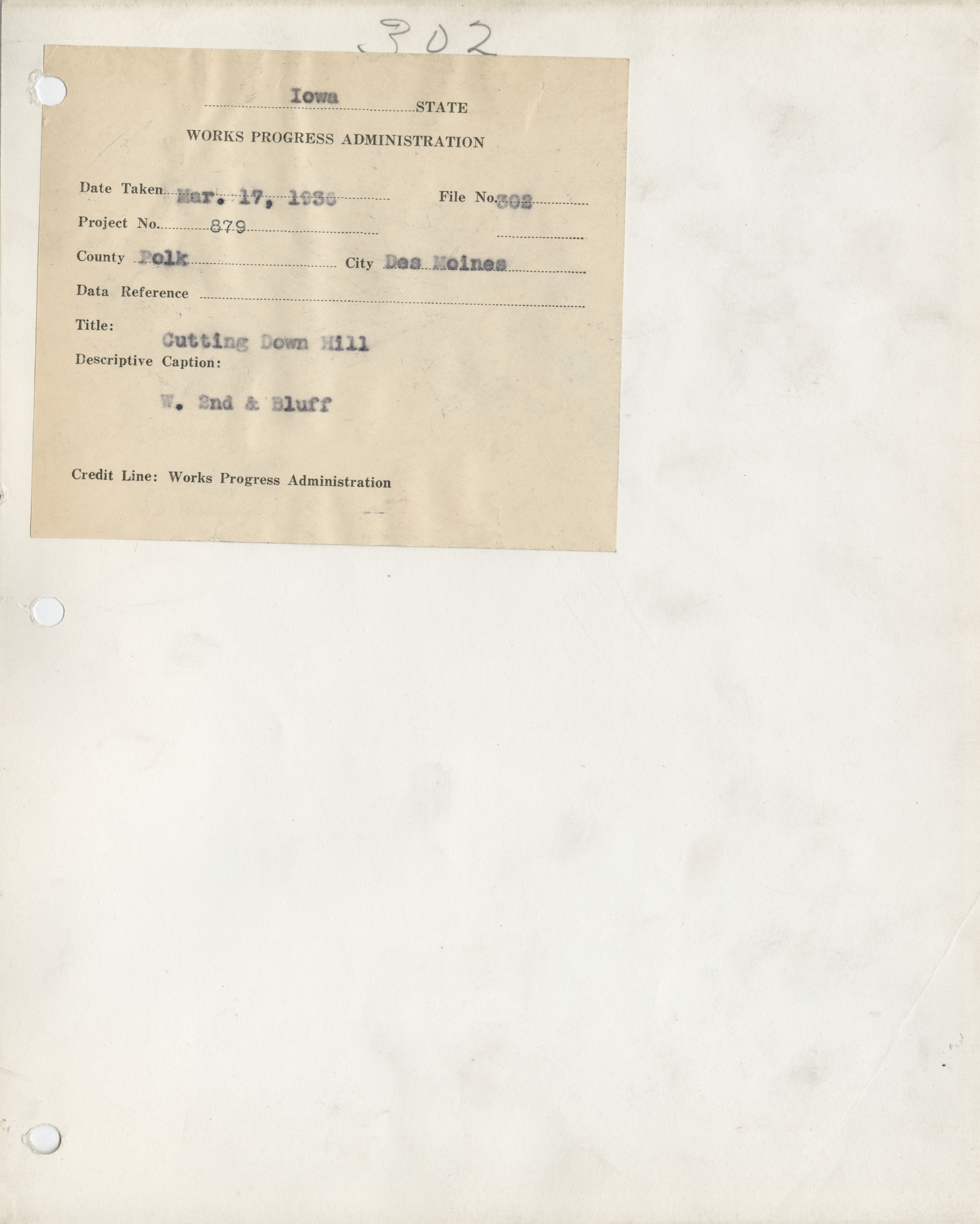 - "Photograph of people cutting down a hill at W 2nd and Bluff in Des Moines", Work Projects Administration (Iowa) Photographs, Iowa State University Library Digital Collections