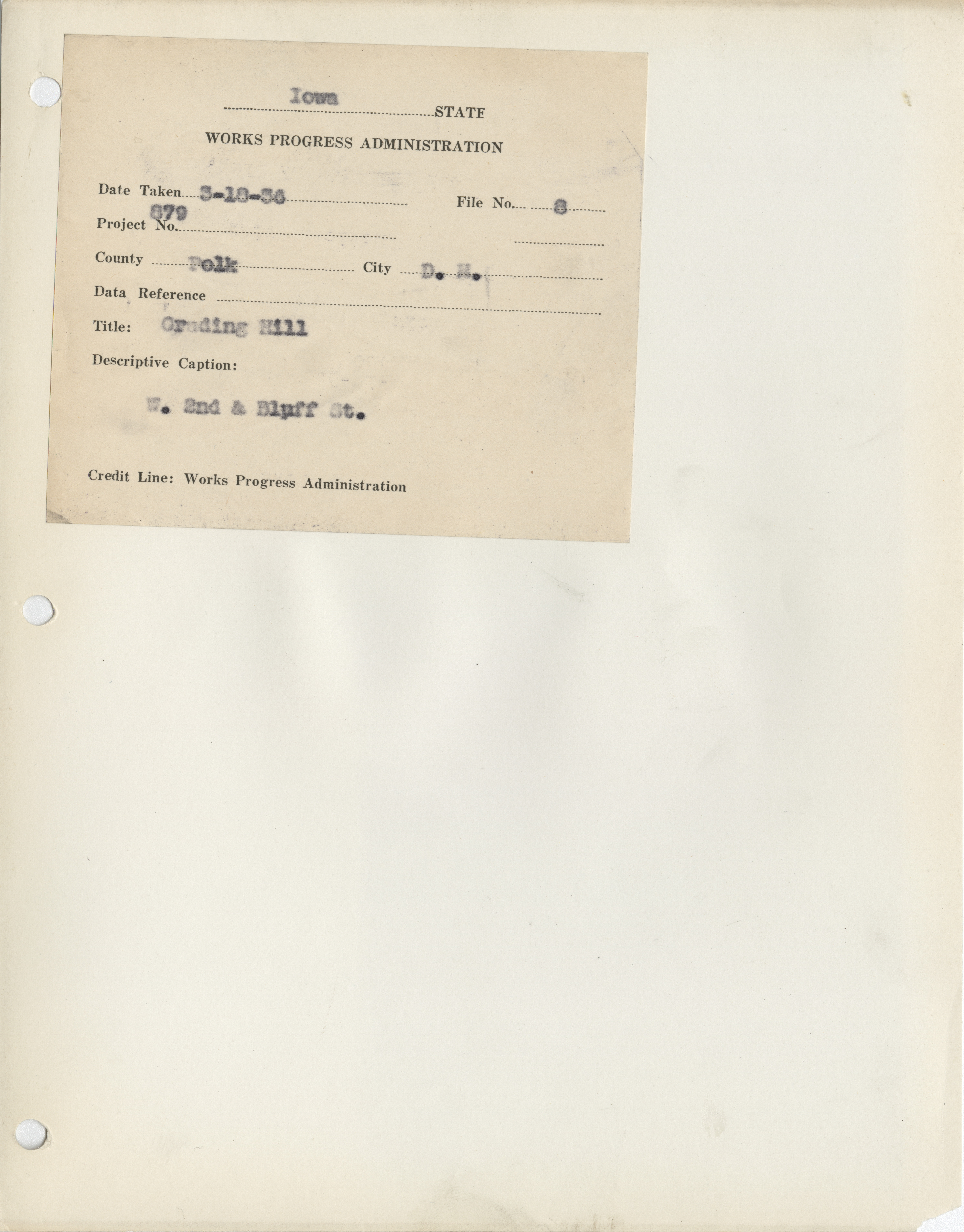 - "Photograph of people grading a hill at W 2nd and Bluff in Des Moines", Work Projects Administration (Iowa) Photographs, Iowa State University Library Digital Collections
