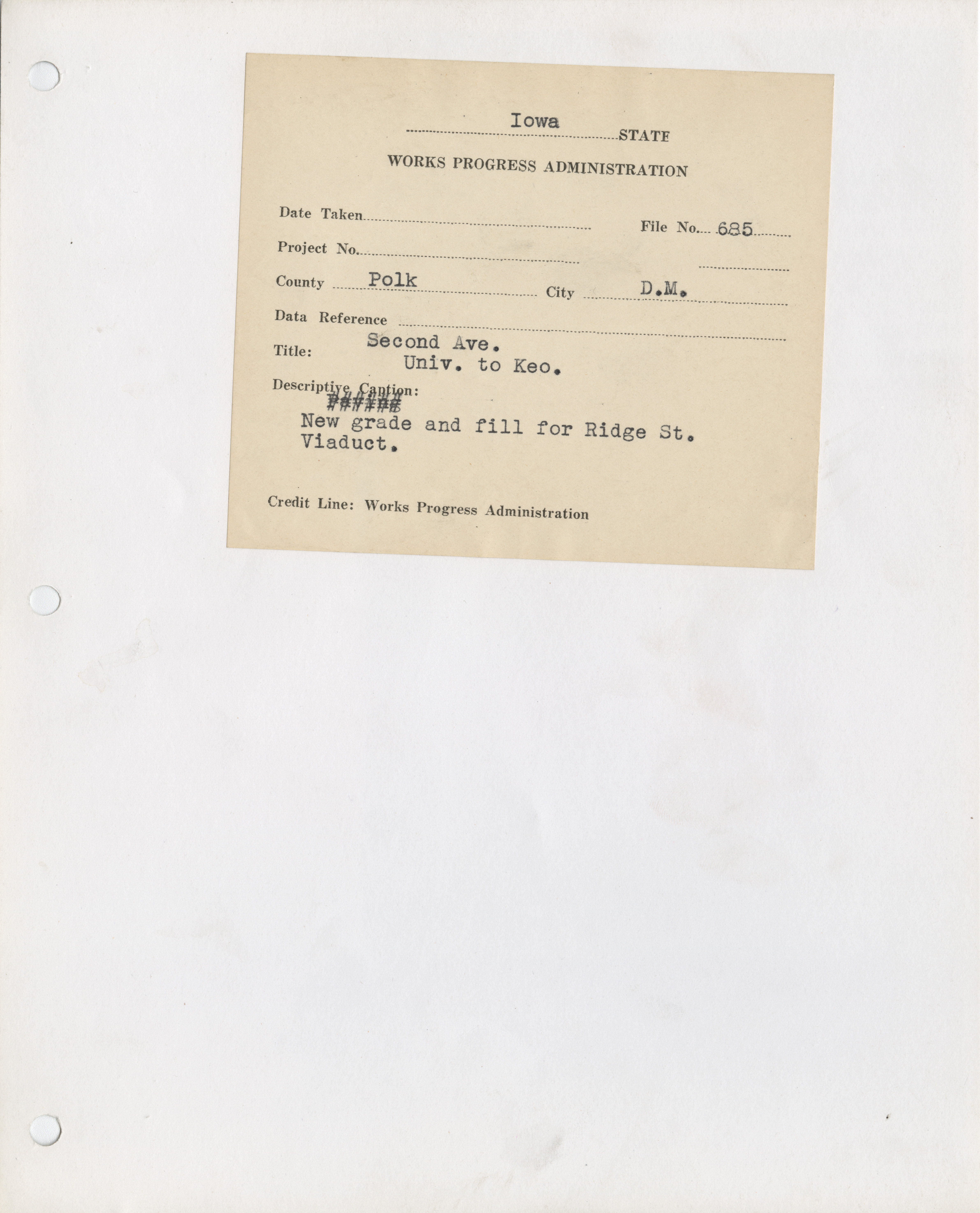 - "Photograph of people working on the grade and fill for the Ridge St. viaduct in Des Moines", Work Projects Administration (Iowa) Photographs, Iowa State University Library Digital Collections